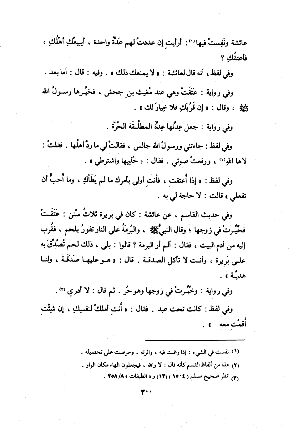 كَانَ فِي بَرِيْرَةَ ثَلاَثُ سُنَنٍ: عَتَقَتْ فَخُيِّرَتْ فِي زَوْجِهَا، وَقَالَ النَّبِيُّ -صَلَّى اللَّهُ عَلَيْهِ وَسَلَّمَ- وَالبُرْمَةُ عَلَى النَّارِ تَفُوْرُ بِلَحْمٍ، فَقُرِّبَ إِلَيْهِ مِنْ أَدَمِ البَيْتِ، فَقَالَ: (أَلَمْ أَرَ البُرْمَةَ؟) .
