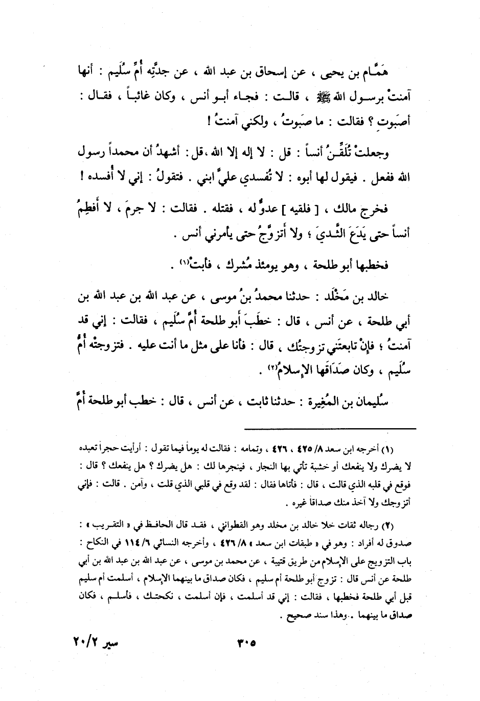 (2) رجاله ثقات خلا خالد بن مخلد وهو القطواني، فقد قال الحافظ في " التقريب ": صدوق له أفراد: وهو في " طبقات ابن سعد " 8 / 426، وأخرجه النسائي 6 / 114 في النكاح: باب التزويج على الإسلام من طريق قتيبة، عن محمد بن موسى، عن عبد الله بن عبد الله بن أبي طلحة عن أنس قال: تزوج أبو طلحة أم سليم، فكان صداق ما بينهما الإسلام، أسلمت أم سليم قبل ابي طلحة فخطبها، فقالت: إني قد أسلمت، فإن أسلمت، نكحتك، فأسلم، فكان صداق ما بينهما.