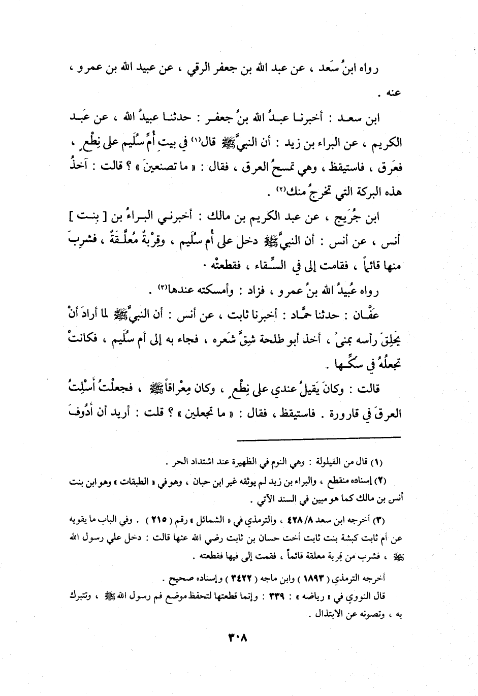أَنَّ النَّبِيَّ -صَلَّى اللَّهُ عَلَيْهِ وَسَلَّمَ- لَمَّا أَرَادَ أَنْ يَحْلِقَ رَأْسَهُ بِمِنَى؛ أَخَذَ أَبُو طَلْحَةَ شِقَّ شَعْرِهِ، فَجَاءَ بِهِ إِلَى أُمِّ سُلَيْمٍ، فَكَانَتْ تَجْعَلُهُ فِي سُكِّهَا.