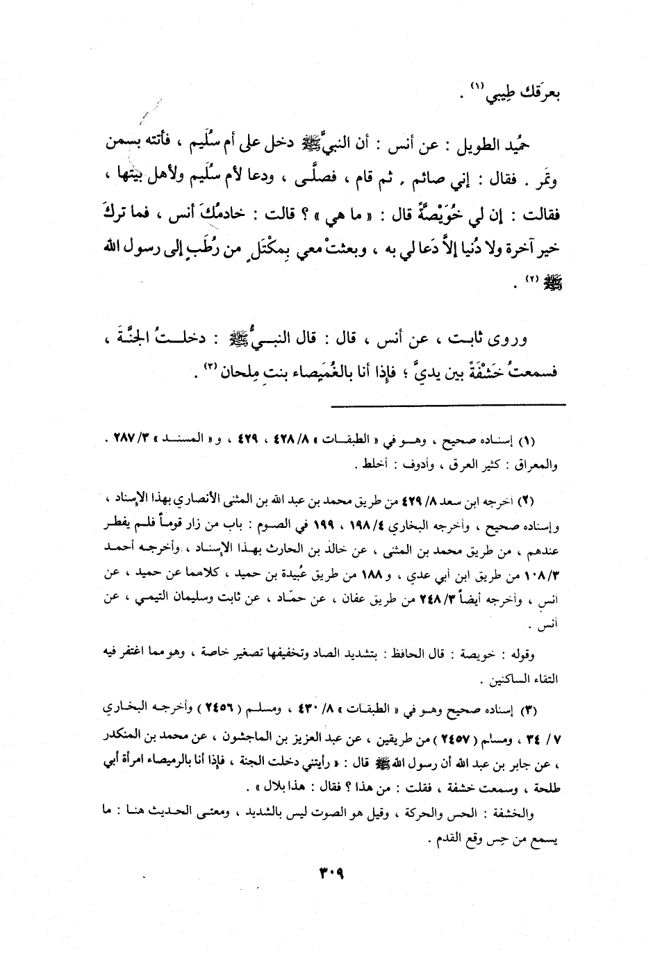 (2) أخرجه ابن سعد 8 / 429 من طريق محمد بن عبد الله بن المثنى الأنصاري بهذا الإسناد، وإسناده صحيح، وأخرجه البخاري 4 / 198، 199 في الصوم: باب من زار قوما فلم يفطر عندهم، من طريق محمد بن المثنى، عن خالد بن الحارث بهذا الإسناد، وأخرجه أحمد 3 / 108 من طريق ابن أبي عدي، و188 من طريق عبيدة بن حميد، كلاهما عن حميد، عن أنس، وأخرجه أيضا 3 / 248 من طريق عفان، عن حماد، عن ثابت وسليمان التيمي، عن أنس.