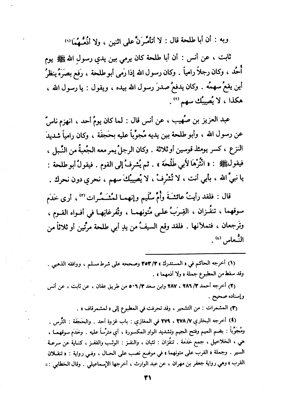 ثُمَّ يُشْرِفُ إِلَى القَوْمِ، فَيَقُوْلُ أَبُو طَلْحَةَ: يَا نَبِيَّ اللهِ، بِأَبِي أَنْتَ، لاَ تُشْرِفْ، لاَ يُصِيْبُكَ سَهْمٌ، نَحْرِي دُوْنَ نَحْرِكَ.