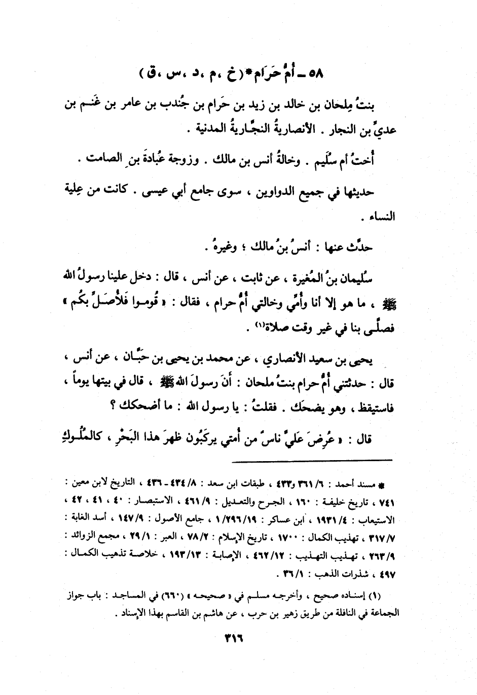 58 - أُمُّ حَرَامٍ بِنْتُ مِلْحَانَ بنِ خَالِدٍ الأَنْصَارِيَّةُ * (خَ، م، د، س، ق)