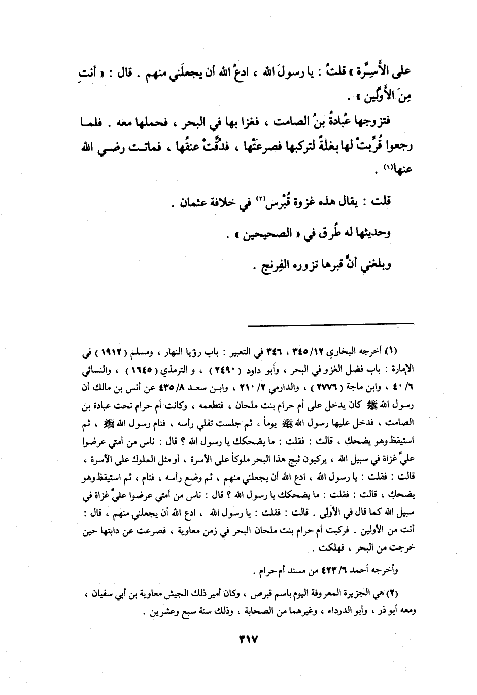 (1) أخرجه البخاري 12 / 345، 346 في التعبير: باب رؤيا النهار، ومسلم (1912) في الامارة: باب فضل الغزو في البحر، وأبو داود (2490) ، والترمذي (1645) ، والنسائي 6 / 40، وابن ماجة (2776) ، والدارمي 2 / 210، وابن سعد 8 / 435 عن أنس بن مالك أن رسول الله صلى الله عليه وسلم كان يدخل على أم حرام بنت ملحان، فتطعمه، وكانت أم حرام تحت عبادة بن الصامت، فدخل عليها رسول الله صلى الله عليه وسلم يوما، ثم جلست تفلي رأسه، فنام رسول الله صلى الله عليه وسلم، ثم استيقظ وهو يضحك، قالت: فقلت: ما يضحك يا رسول الله؟ قال: ناس من أمتي عرضوا علي غزاة في سبيل الله، يركبون ثبج هذا البحر ملوكا على الاسرة، أو مثل الملوك على الاسرة، قالت: فقلت: يا رسول الله، ادع الله أن يجعلني منهم، ثم وضع رأسه، فنام، ثم استيقظ وهو يضحك، قالت: فقلت: ما يضحك يا رسول الله؟ قال: ناس من أمتي عرضوا علي غزاة في سبيل الله كما قال في الأولى.