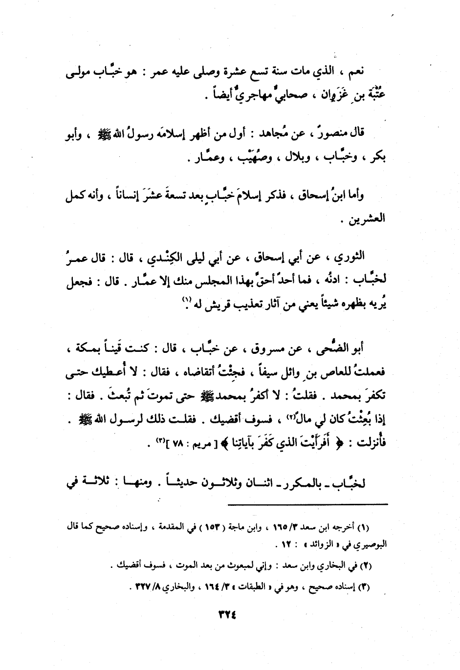 وَأَمَّا ابْنُ إِسْحَاقَ فَذَكَرَ إِسْلاَمَ خَبَّابٍ بَعْدَ تِسْعَةَ عَشَرَ إِنْسَاناً، وَأَنَّهُ كَمَّلَ العِشْرِيْنَ.