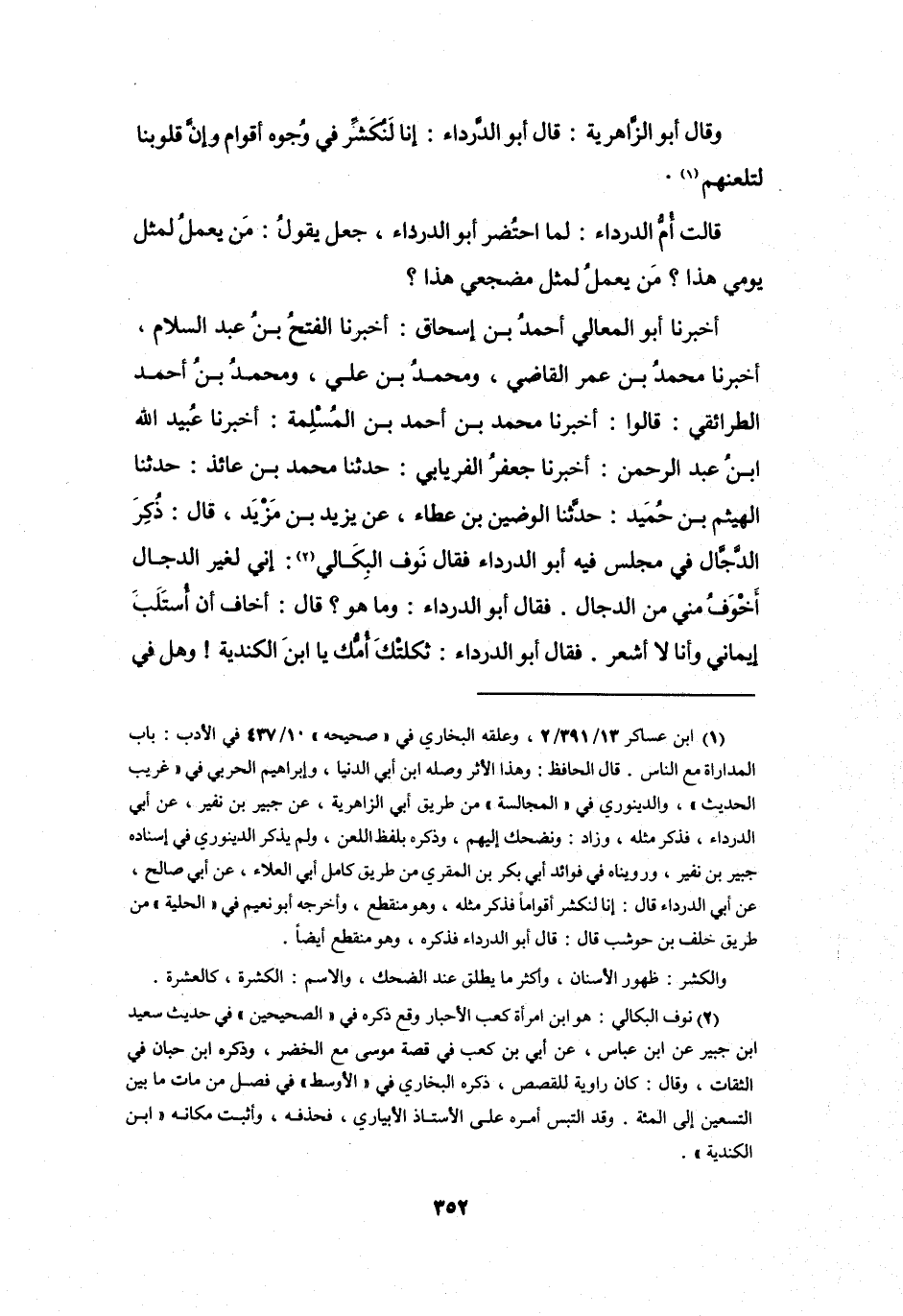 (1) ابن عساكر 13 / 391 / 2، وعلقه البخاري في " صحيحه " 10 / 437 في الأدب: باب المداراة مع الناس، قال الحافظ: وهذا الاثر وصله ابن أبي الدنيا، وإبراهيم الحربي في " غريب الحديث "، والدينوري في " المجالسة " من طريق أبي الزاهرية، عن جبير بن نفير، عن أبي الحديث "، والدينوري في " المجالسة " من طريق أبي الزاهرية، عن جبير بن نفير، عن أبي الدرداء، فذكر مثله، وزاد: ونضحك إليهم، وذكره بلفظ اللعن، ولم يذكر الدينوري في إسناده جبير بن نفير، ورويناه في فوائد أبي بكر بن المقري من طريق كامل أبي العلاء، عن أبي صالح، عن أبي الدرداء قال: إنا لنكشر أقواما فذكر مثله، وهو منقطع، وأخرجه أبو نعيم في " الحلية " من طريق خلف بن حوشب قال: قال أبو الدرداء فذكره، وهو منقطع أيضا.