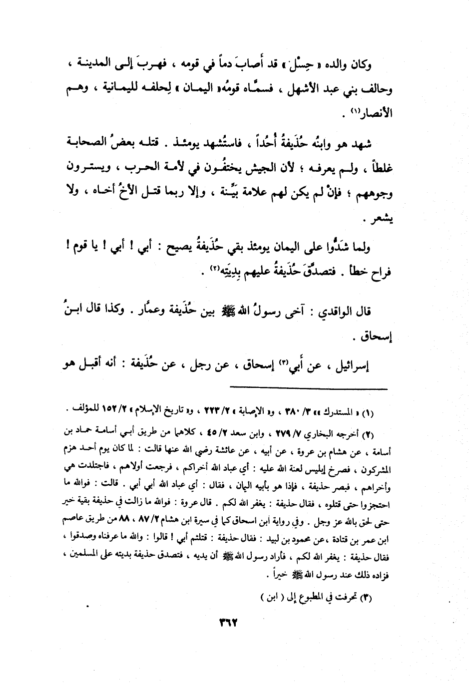 وَلَمَّا شَدُّوْا عَلَى اليَمَانِ يَوْمَئِذٍ، بَقِيَ حُذَيْفَةُ يَصِيْحُ: أَبِي! أَبِي! يَا قَوْمُ! فَرَاحَ خَطَأً، فَتَصَدَّقَ حُذَيْفَةُ عَلَيْهِم بِدِيَتِهِ (2) .