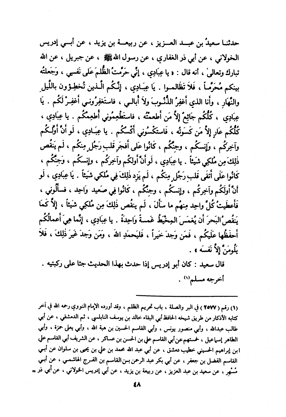 (1) رقم (2577) في البر والصلة، باب تحريم الظلم، وقد أورده الامام النووي رحمه الله في آخر كتابه الأذكار من طريق شيخه الحافظ أبي البقاء خالد بن يوسف النابلسي، ثم الدمشقي، عن أبي طالب عبد الله، وأبي منصور يونس، وأبي القاسم الحسين بن هبة الله، وأبي يعلى حمزة، وأبي الطاهر إسماعيل، خمستهم عن أبي القاسم علي بن الحسن بن عساكر، عن الشريف أبي القاسم علي ابن إبراهيم الحسيني خطيب دمشق، عن أبي عبد الله محمد بن علي بن يحيى بن سلوان عن أبي القاسم الفضل بن جعفر، عن أبي بكر عبد الرحمن بن القاسم بن الفرج الهاشمي، عن أبي مسهر، عن سعيد بن عبد العزيز، عن ربيعة بن يزيد، عن أبي إدريس الخولاني، عن أبي ذر =