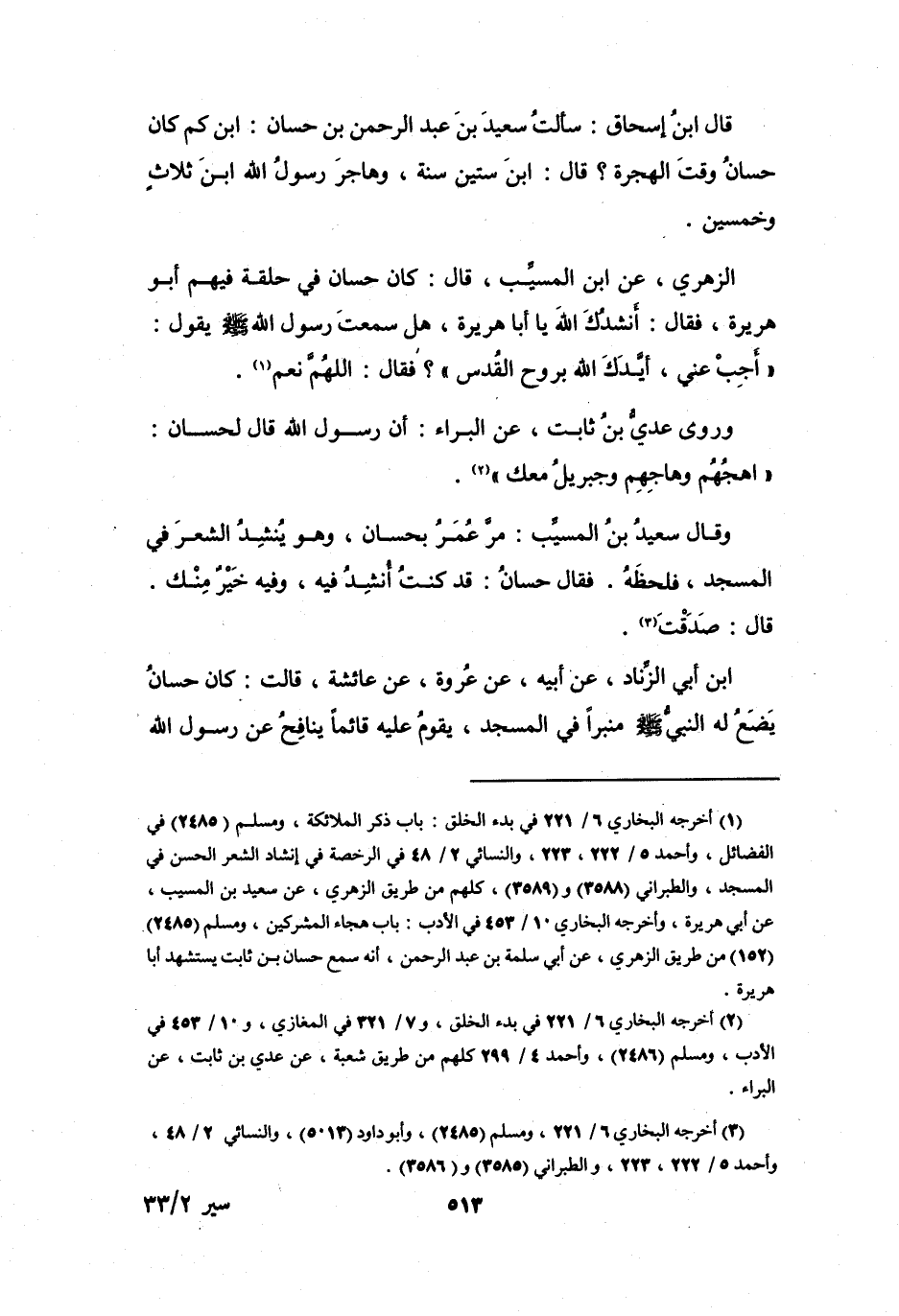 (1) أخرجه البخاري 6 / 221 في بدء الخلق: باب ذكر الملائكة، ومسلم (2485) في الفضائل، وأحمد 5 / 222، 223، والنسائي 2 / 48 في الرخصة في إنشاد الشعر الحسن في المسجد، والطبراني (3588) و (3589) ، كلهم من طريق الزهري، عن سعيد بن المسيب، عن أبي هريرة، وأخرجه البخاري 10 / 453 في الأدب: باب هجاء المشركين، ومسلم (2485) (152) من طريق الزهري، عن أبي سلمة بن عبد الرحمن، أنه سمع حسان بن ثابت يستشهد أبا هريرة.