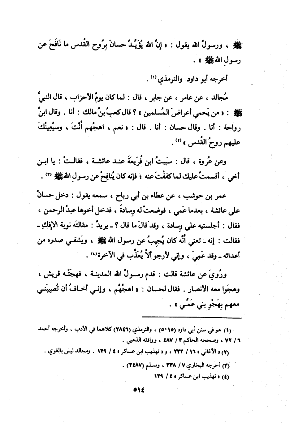 وَرَسُوْلُ اللهِ يَقُوْلُ: (إِنَّ اللهَ يُؤَيِّدُ حَسَّانَ بِرُوْحِ القُدُسِ مَا نَافَحَ عَنْ رَسُوْلِ اللهِ -صَلَّى اللَّهُ عَلَيْهِ وَسَلَّمَ-) .