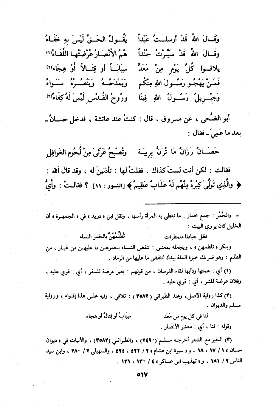 (3) الخبر مع الشعر أخرجه مسلم (2490) ، والطبراني (3582) ، والابيات في " ديوان حسان " 1 / 17، 18، و" سيرة ابن هشام " 2 / 421، 424، والسهيلي 2 / 280، وابن سيد الناس 2 / 181، و" تهذيب ابن عساكر " 4 / 130، 131.