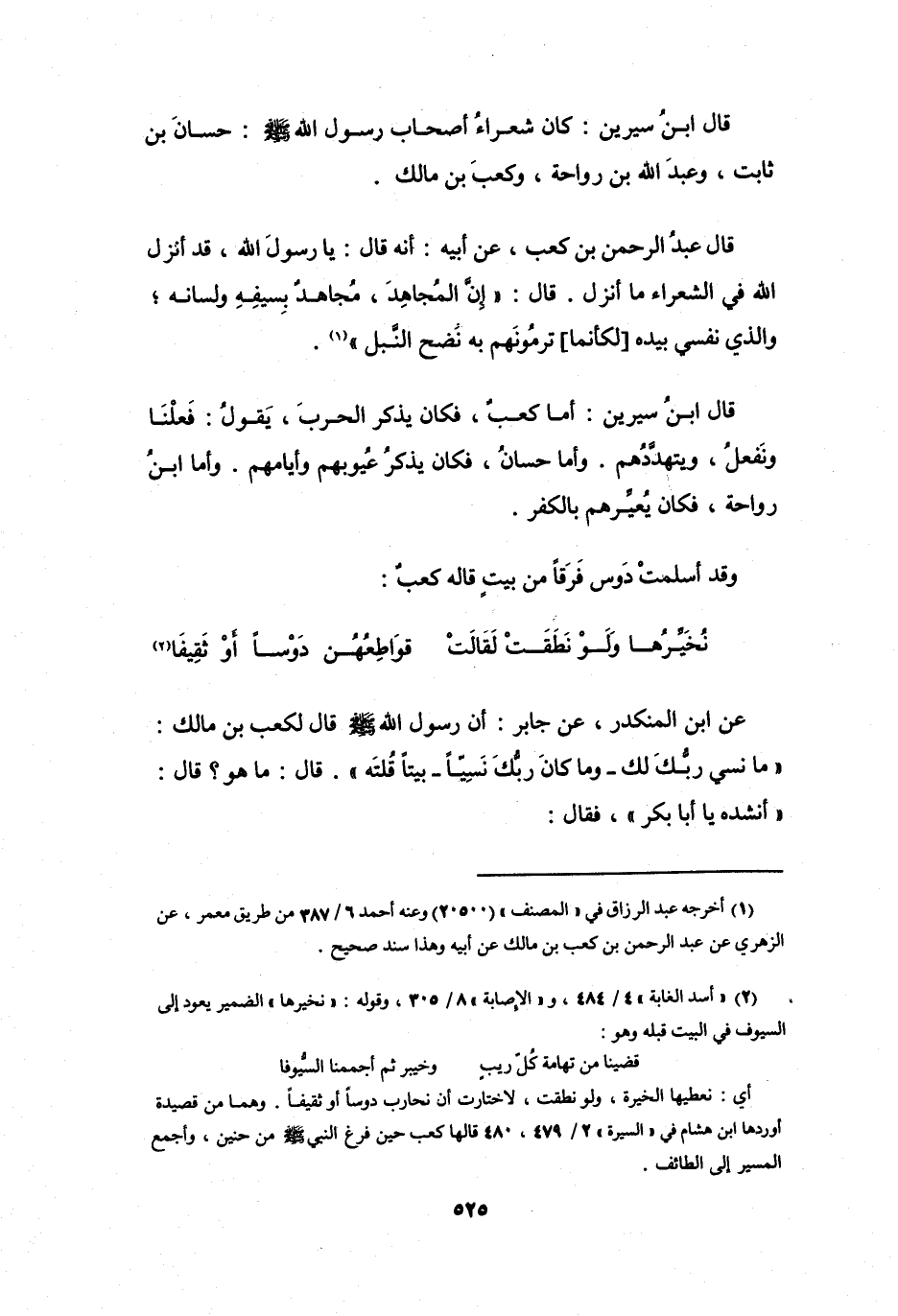 قَالَ ابْنُ سِيْرِيْنَ: كَانَ شُعَرَاءُ أَصْحَابِ رَسُوْلِ اللهِ -صَلَّى اللَّهُ عَلَيْهِ وَسَلَّمَ-: حَسَّانُ بنُ ثَابِتٍ، وَعَبْدُ اللهِ بنُ رَوَاحَةَ، وَكَعْبُ بنُ مَالِكٍ.