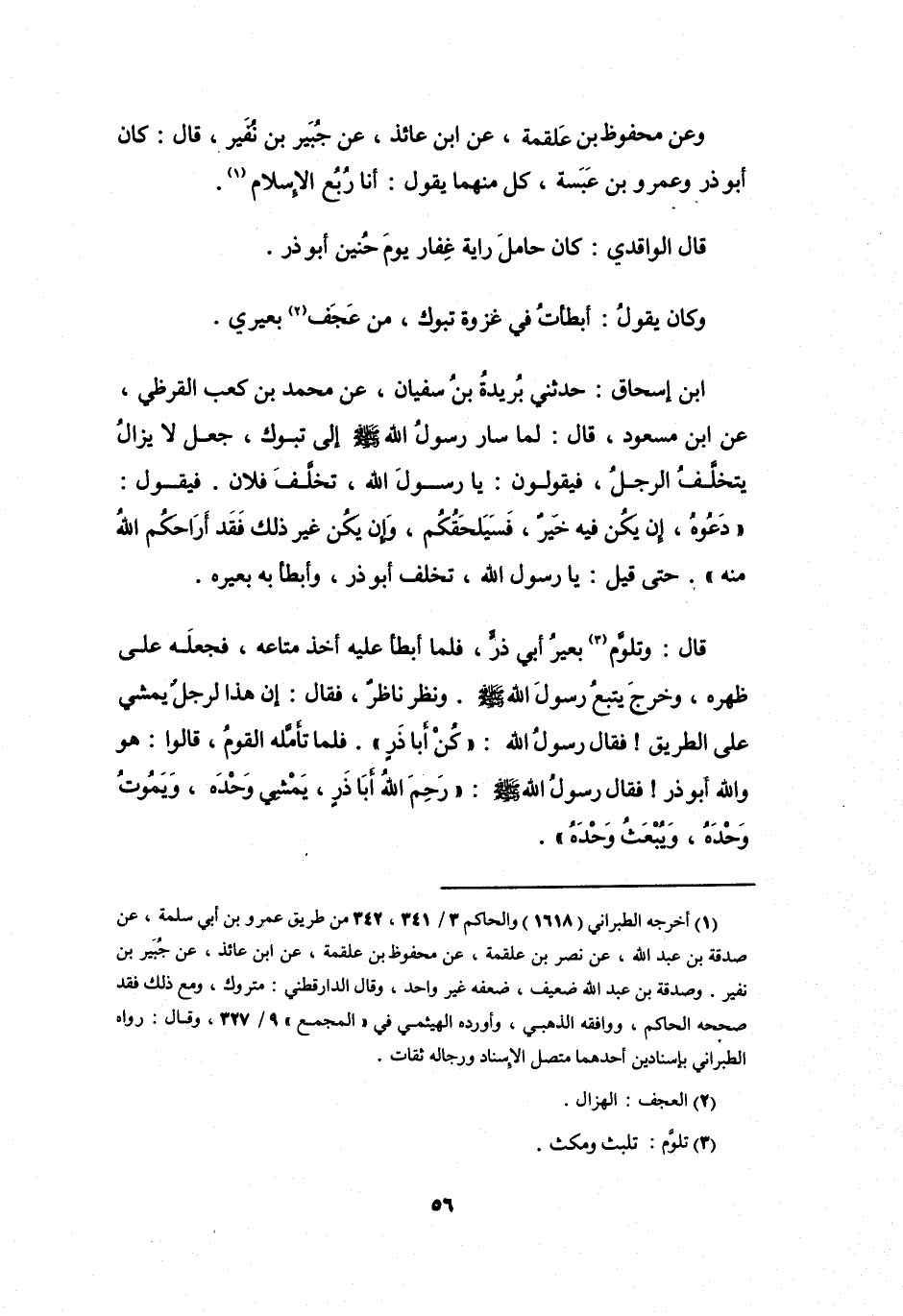 قَالَ: وَتَلَوَّمَ (3) بَعِيْرُ أَبِي ذَرٍّ، فَلَمَّا أَبْطَأَ عَلَيْهِ أَخَذَ مَتَاعَهُ، فَجَعَلَهُ عَلَى ظَهْرِهِ، وَخَرَجَ يَتْبَعُ رَسُوْلَ اللهِ -صَلَّى اللَّهُ عَلَيْهِ وَسَلَّمَ-.