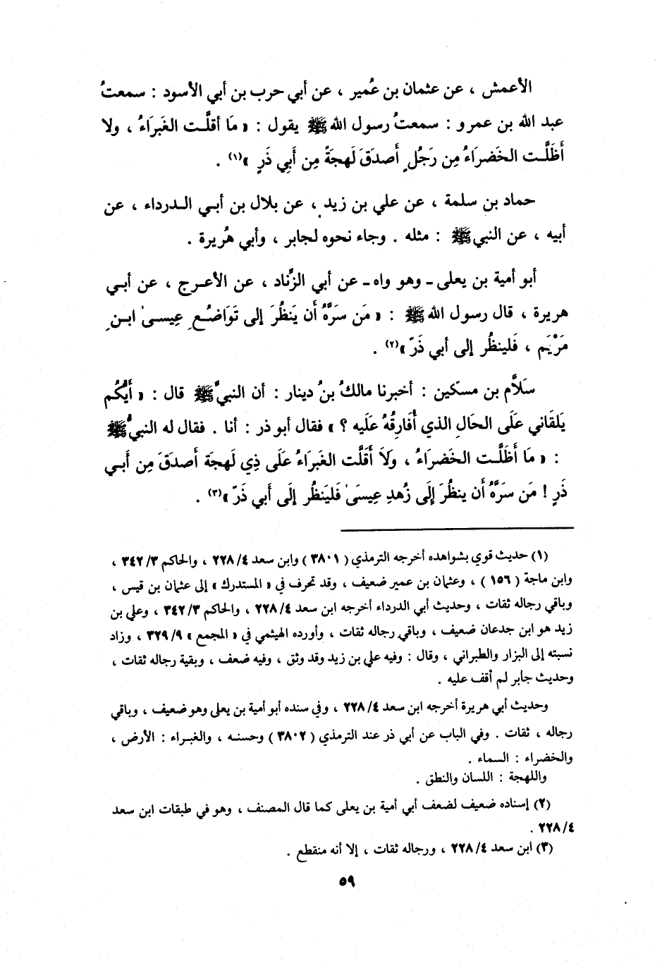 فَقَالَ لَهُ النَّبِيُّ -صَلَّى اللَّهُ عَلَيْهِ وَسَلَّمَ-: (مَا أَظَلَّتِ الخَضْرَاءُ، وَلاَ أَقَلَّتِ الغَبْرَاءُ عَلَى ذِي لَهْجَةٍ أَصْدَقَ مِنْ أَبِي ذَرٍّ! مَنْ سَرَّهُ أَنْ يَنْظُرَ إِلَى زُهْدِ عِيْسَى فَلْيَنْظُرْ إِلَى أَبِي ذَرٍّ) (3) .