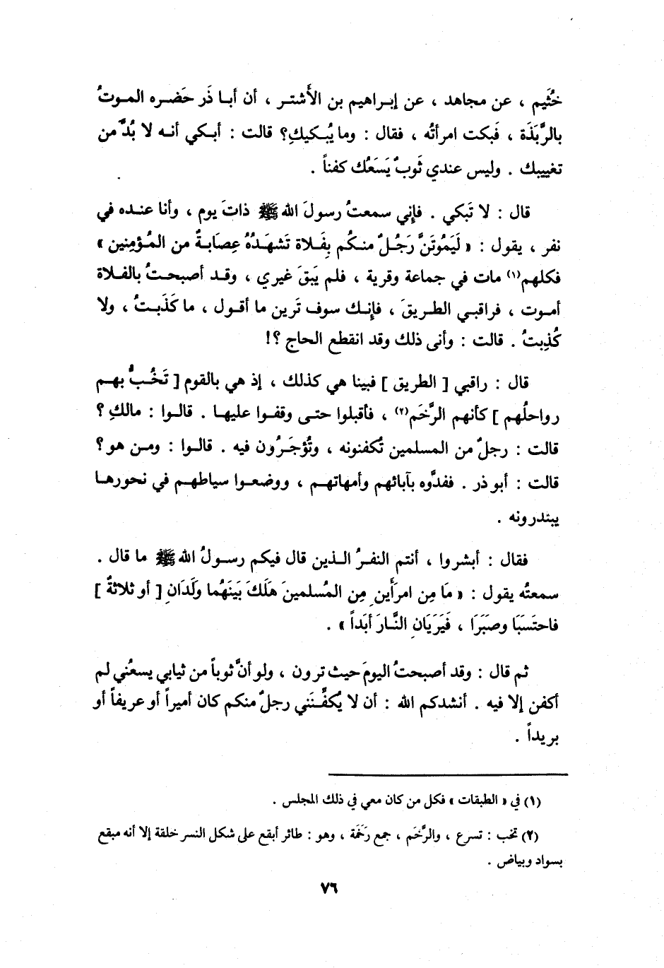 قَالَ: لاَ تَبْكِي، فَإِنِّي سَمِعْتُ رَسُوْلَ اللهِ -صَلَّى اللَّهُ عَلَيْهِ وَسَلَّمَ- ذَاتَ يَوْمٍ وَأَنَا عِنْدَهُ فِي نَفَرٍ يَقُوْلُ: (لَيَمُوْتَنَّ رَجُلٌ مِنْكُمْ بِفَلاَةٍ تَشْهَدُهُ عِصَابَةٌ مِنَ المُؤْمِنِيْنَ) .