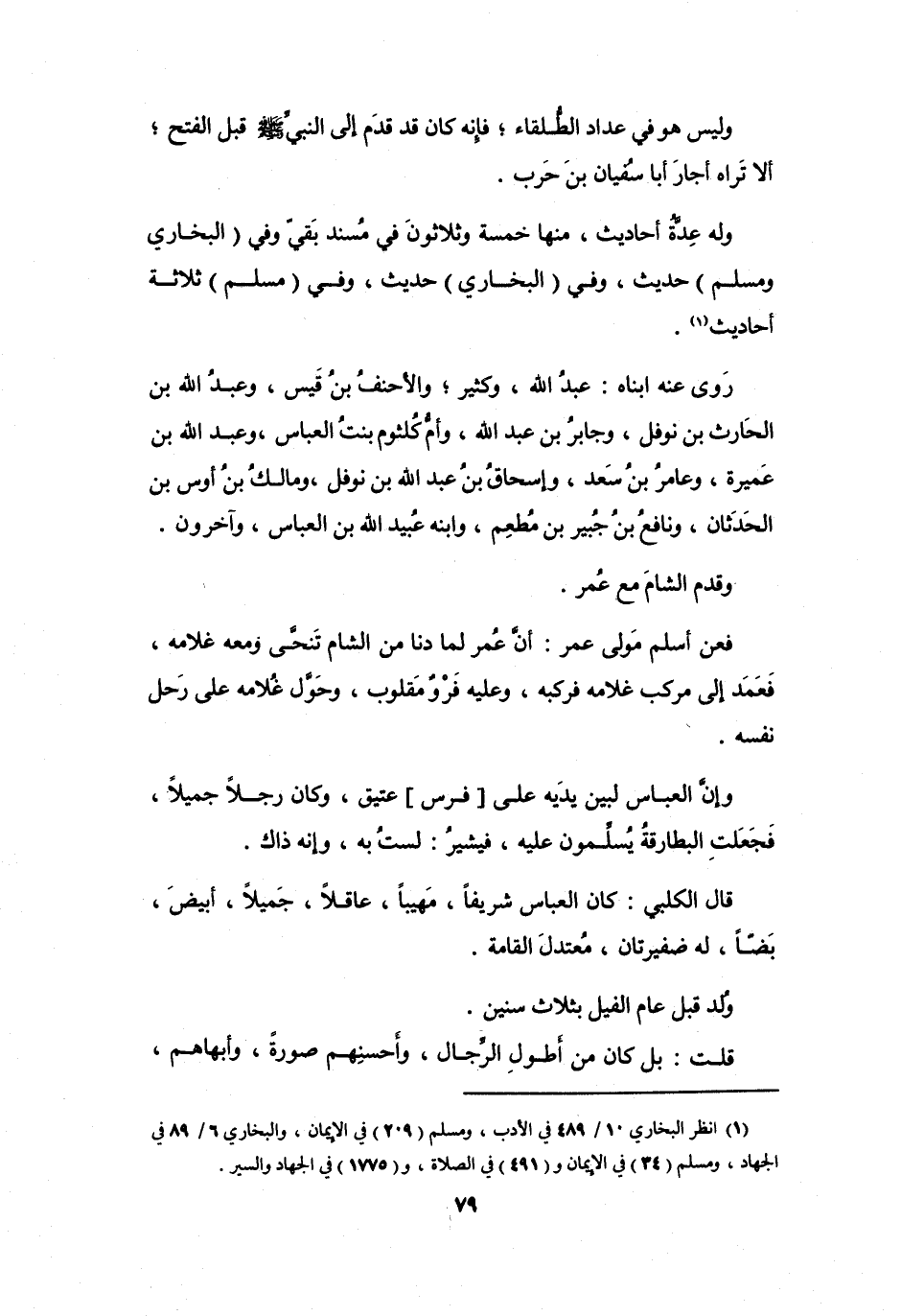 وَإِنَّ العَبَّاسَ لَبَيْنَ يَدَيْهِ عَلَى فَرَسٍ عَتِيْقٍ، وَكَانَ رَجُلاً جَمِيْلاً، فَجَعَلتِ البَطَارِقَةُ يُسَلِّمُوْنَ عَلَيْهِ، فَيُشِيْرُ: لَسْتُ بِهِ، وَإِنَّهُ ذَاكَ.