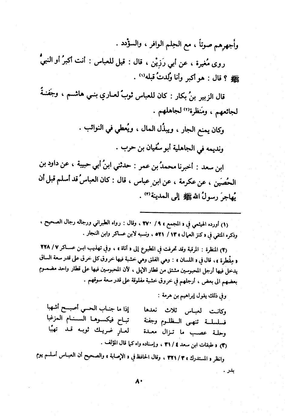 قَالَ الزُّبَيْرُ بنُ بَكَّارٍ: كَانَ لِلعَبَّاسِ ثَوْبٌ لِعَارِي بَنِي هَاشِمٍ، وَجَفْنَةٌ لِجَائِعِهِمْ، وَمَنْظَرَةٌ (2) لِجَاهِلِهِمْ.