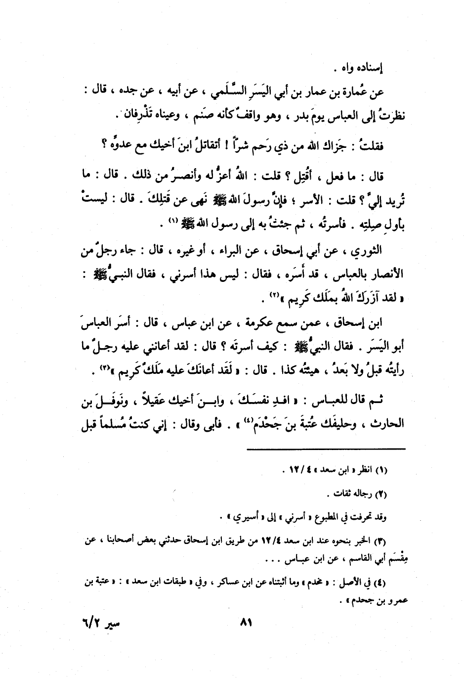 ثُمَّ قَالَ لِلعَبَّاسِ: افْدِ نَفْسَكَ، وَابْنَ أَخِيْكَ عَقِيْلاً، وَنَوْفَلَ بنَ الحَارِثِ، وَحَلِيْفَكَ عُتْبَةَ بنَ جَحْدَمٍ (4) .