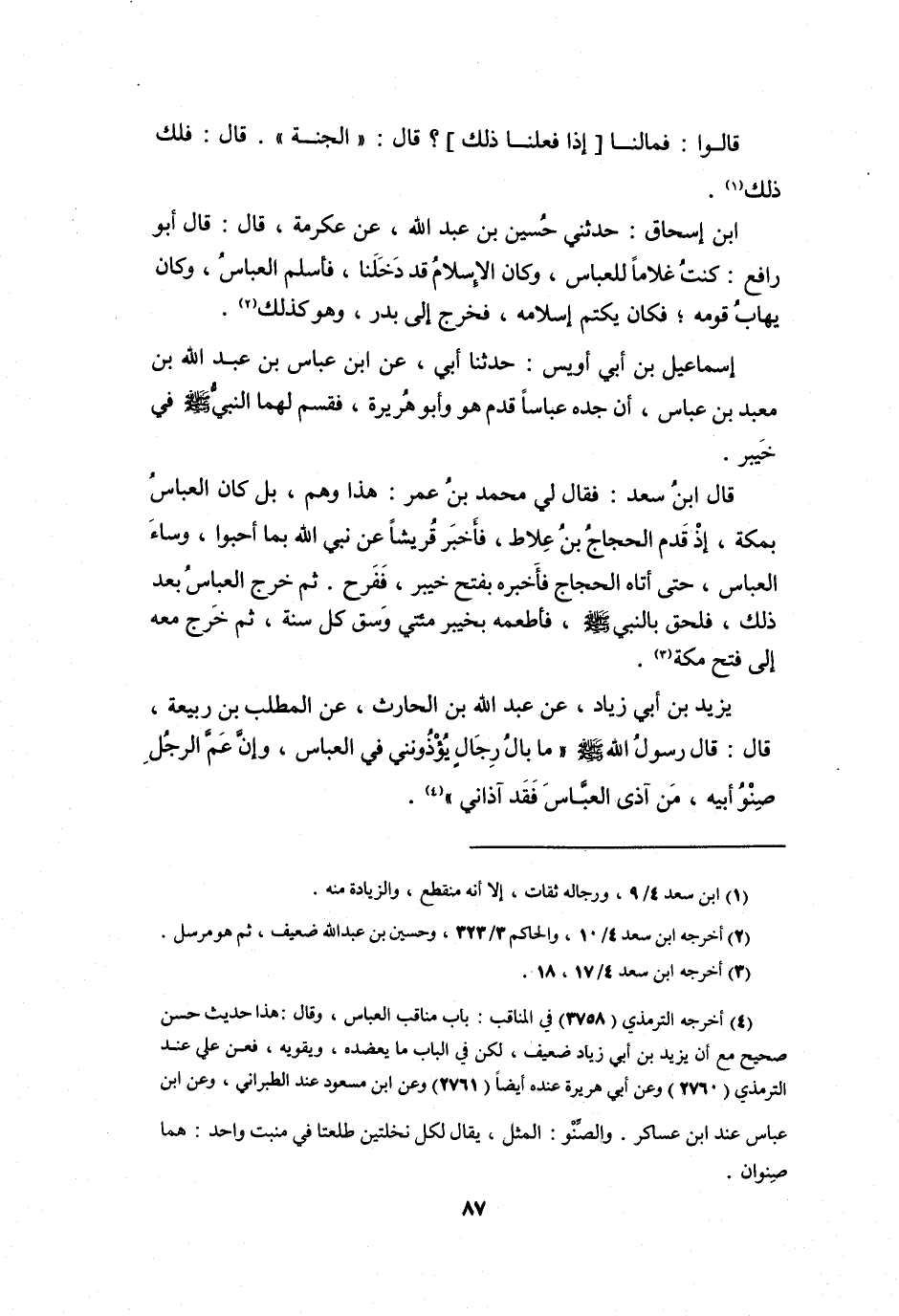 (4) أخرجه الترمذي (3758) في المناقب: باب مناقب العباس، وقال: هذا حديث حسن صحيح مع أن يزيد بن أبي زياد ضعيف، لكن في الباب ما يعضده، ويقويه، فعن علي عند الترمذي (2760) وعن أبي هريرة عنده أيضا (2761) وعن ابن مسعود عند الطبراني، وعن ابن عباس عند ابن عساكر.