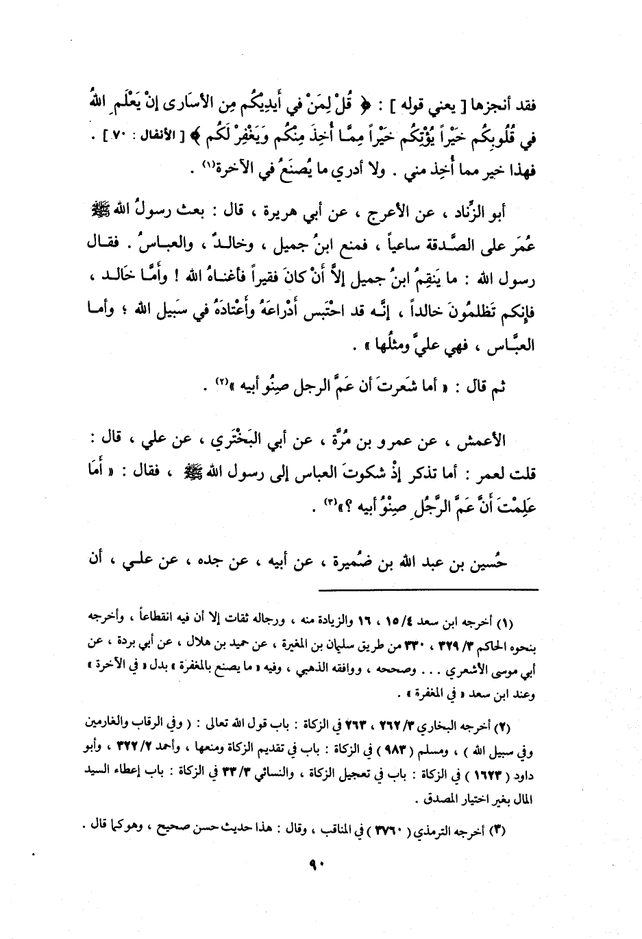 فَقَالَ رَسُوْلُ اللهِ -صَلَّى اللَّهُ عَلَيْهِ وَسَلَّمَ-: (مَا يَنْقِمُ ابْنُ جَمِيْلٍ إِلاَّ أَنْ كَانَ فَقِيْراً فَأَغْنَاهُ اللهُ! وَأَمَّا خَالِدٌ، فَإِنَّكُمْ تَظْلِمُوْنَ خَالِداً، إِنَّهُ قَدِ احْتَبَسَ أَدْرَاعَهُ وَأَعْتَادَهُ فِي سَبِيْلِ اللهِ؛ وَأَمَّا العَبَّاسُ، فَهِيَ عَلَيَّ وَمِثْلُهَا) .