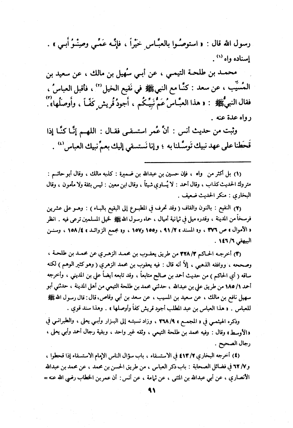 (3) أخرجه الحاكم 3 / 328 من طريق يعقوب بن محمد الزهري عن محمد بن طلحة، وصححه، ووافقه الذهبي، إلا أنه قال: فيه يعقوب بن محمد الزهري (وهو كثير الوهم) لكنه ساقه (أي الحاكم) من حديث أحمد بن صالح متابعا، وقد تابعه أيضا علي بن المديني، وأخرجه أحمد 1 / 185 من طريق علي بن عبد الله، حدثني محمد بن طلحة التيمي من أهل المدينة، حدثني أبو سهيل نافع بن مالك، عن سعيد بن المسيب، عن سعد بن أبي وقاص، قال: قال رسول الله صلى الله عليه وسلم للعباس.