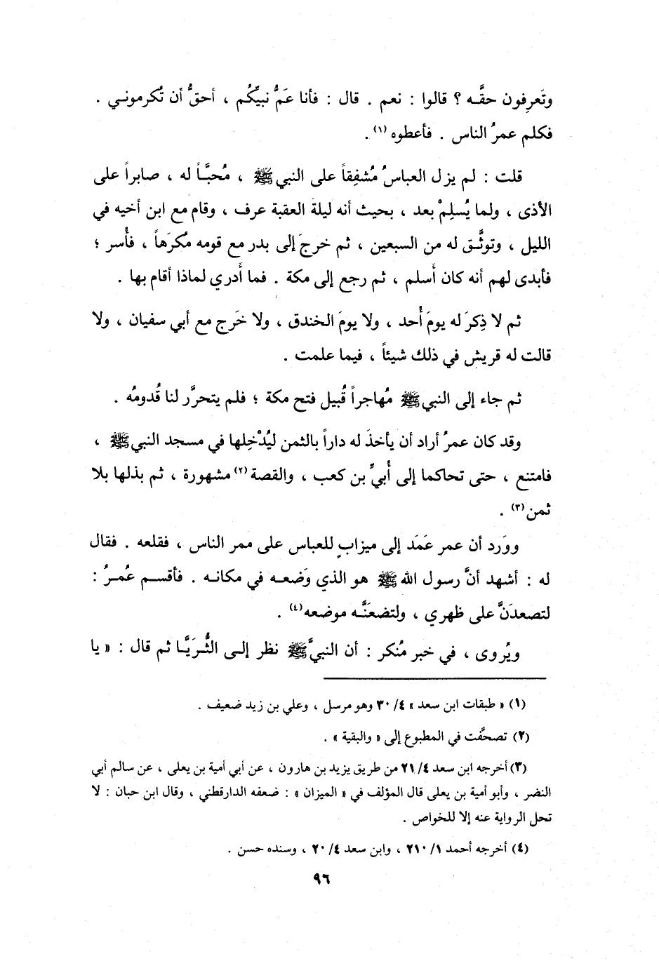 قُلْتُ: لَمْ يَزَلِ العَبَّاسُ مُشْفِقاً عَلَى النَّبِيِّ -صَلَّى اللَّهُ عَلَيْهِ وَسَلَّمَ- مُحِبّاً لَهُ، صَابِراً عَلَى الأَذَى، وَلَمَّا يُسْلِمْ بَعْدُ، بِحَيْثُ أَنَّهُ لَيْلَةَ العَقَبَةِ عُرِفَ، وَقَامَ مَعَ ابْنِ أَخِيْهِ فِي اللَّيْلِ، وَتَوَثَّقَ لَهُ مِنَ السَّبْعِيْنَ، ثُمَّ خَرَجَ إِلَى بَدْرٍ مَعَ قَوْمِهِ مُكْرَهاً؛ فَأُسِرَ، فَأَبْدَى لَهُم أَنَّهُ كَانَ أَسْلَمَ، ثُمَّ رَجَعَ إِلَى مَكَّةَ.