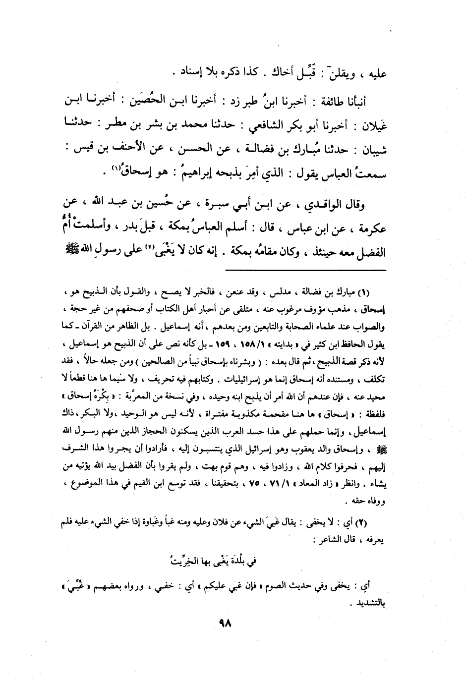 (1) مبارك بن فضالة، مدلس، وقد عنعن، فالخبر لا يصح، والقول بأن الذبيح هو، إسحاق، مذهب مؤوف مرغوب عنه، متلقى عن أحبار أهل الكتاب أو صحفهم من غير حجة، والصواب عند علما الصحابة والتابعين ومن بعدهم، أنه إسماعيل.