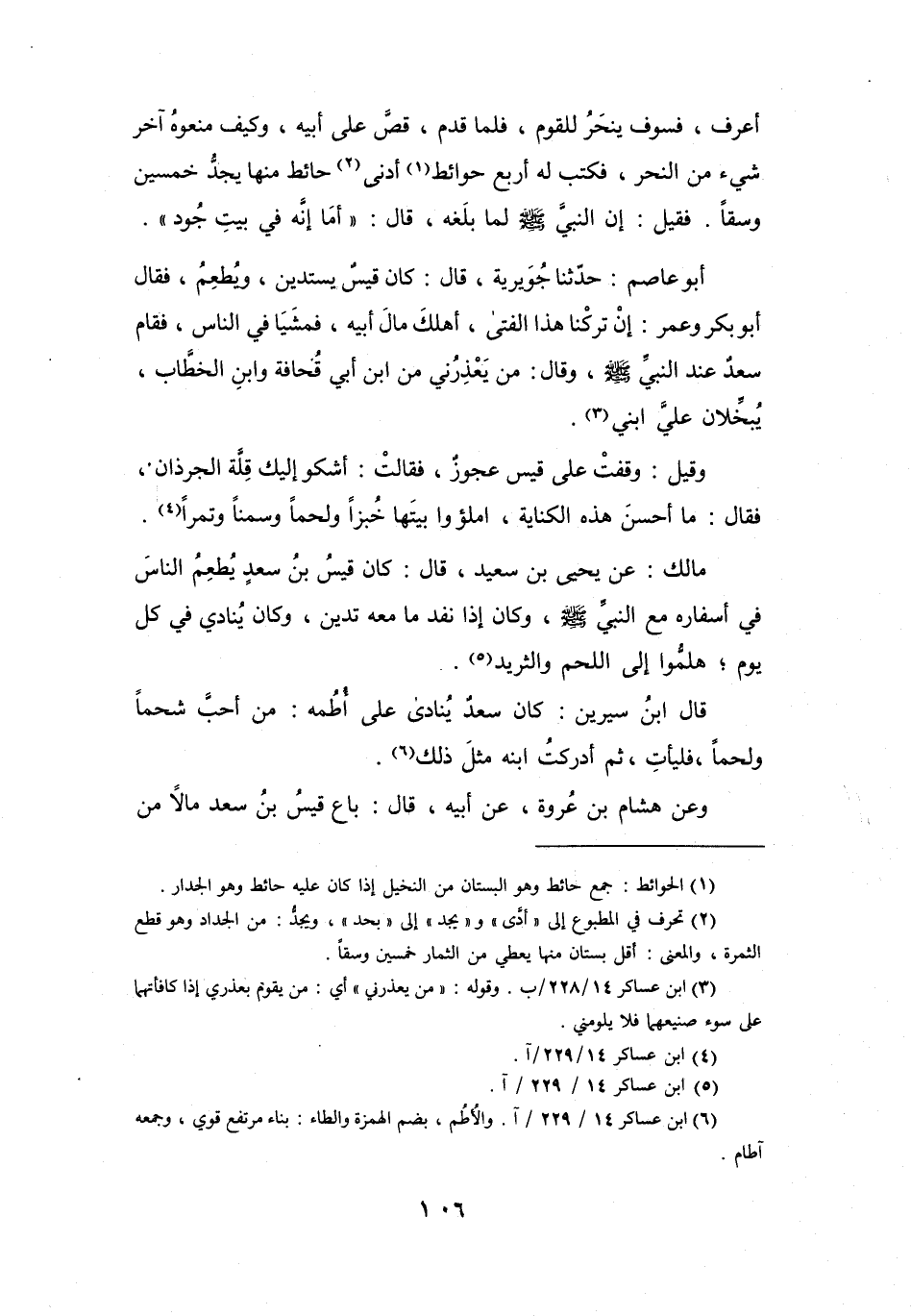 كَانَ قَيْسُ بنُ سَعْدٍ يُطْعِمُ النَّاسَ فِي أَسْفَارِهِ مَعَ النَّبِيِّ -صَلَّى اللَّهُ عَلَيْهِ وَسَلَّمَ - وَكَانَ إِذَا نَفِدَ مَا مَعَهُ تَدَيَّنَ، وَكَانَ يُنَادِي فِي كُلِّ يَوْمٍ: هَلُمُّوا إِلَى اللَّحْمِ وَالثَّرِيْدِ (5) .