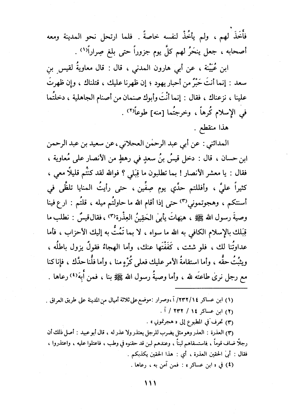 فَقَالَ قَيْسٌ: نَطْلُبُ مَا قِبَلَكَ بِالإِسْلاَمِ الكَافِي بِهِ اللهُ مَا سِوَاهُ، لاَ بِمَا تَمُتُّ بِهِ إِلَيْكَ الأَحْزَابُ، فَأَمَّا عَدَاوَتُنَا لَكَ، فَلَو شِئْتَ كَفَفْتَهَا عَنْكَ، وَأَمَّا الهِجَاءُ فَقَوْلٌ يَزُوْلُ بَاطِلُهُ، وَيَثْبُتُ حَقُّهُ، وَأَمَّا اسْتِقَامَةُ الأَمْرِ عَلَيْكَ فَعَلَى كُرْهٍ مِنَّا، وَأَمَّا فَلُّنَا حَدَّكَ، فَإِنَّا كُنَّا مَعَ رَجُلٍ نَرَى طَاعَتَهُ للهِ، وَأَمَّا وَصِيَّةُ رَسُوْلِ اللهِ -صَلَّى اللَّهُ عَلَيْهِ وَسَلَّمَ - بِنَا، فَمَنْ أَبِهَ (4) رَعَاهَا،