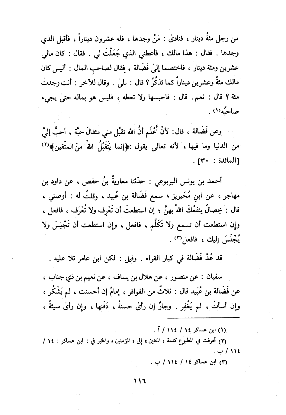 وَعَنْ فَضَالَةَ، قَالَ: لأَنْ أَعْلَمُ أَنَّ اللهَ تَقَبَّلَ مِنِّي مِثْقَالَ حَبَّةٍ، أَحَبُّ إِلَيَّ مِنَ الدُّنْيَا وَمَا فِيْهَا، لأَنَّهُ تَعَالَى يَقُوْلُ: {إِنَّمَا يَتَقَبَّلُ اللهُ مِنَ المُتَّقِيْنَ (2) } [المَائِدَةُ: 30] .