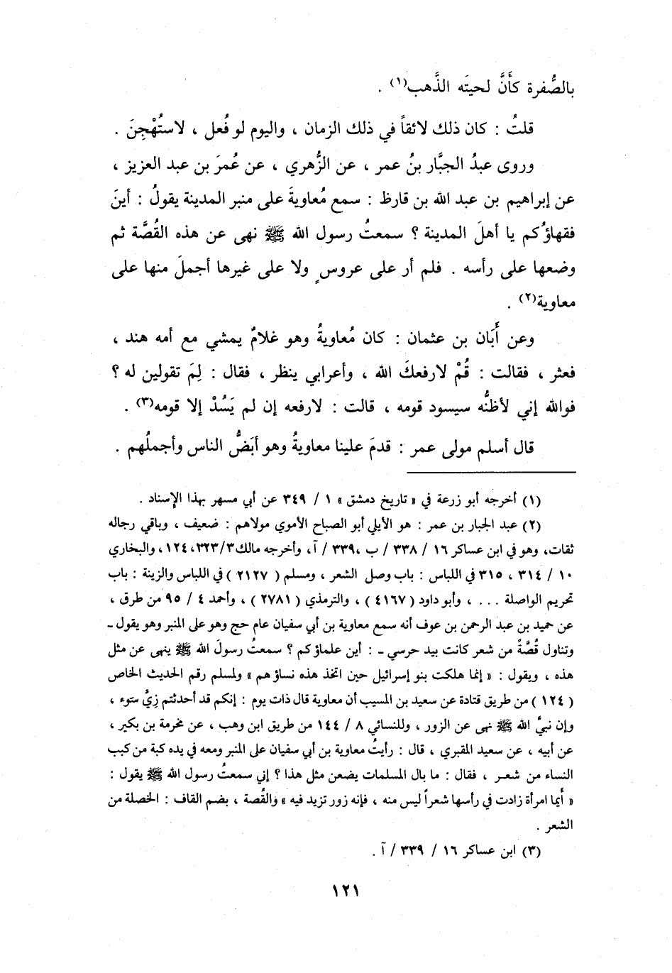 (2) عبد الجبار بن عمر: هو الايلي أبو الصباح الأموي مولاهم: ضعيف، وباقي رجاله ثقات، وهو في ابن عساكر 16 / 338 / ب، 339 / آ، وأخرجه مالك 3 / 323، 124، والبخاري 10 / 314، 315 في اللباس: باب وصل الشعر، ومسلم (2127) في اللباس والزينة: باب تحريم الواصلة ... ، وأبو داود (4167) ، والترمذي (2781) ، وأحمد 4 / 95 من طرق، عن حميد بن عبد الرحمن بن عوف أنه سمع معاوية بن أبي سفيان عام حج وهو على المنبر وهو يقول - وتناول قصة من شعر كانت بيد حرسي -: أين علماؤكم؟ سمعت رسول الله صلى الله عليه وسلم ينهى عن مثل هذه، ويقول: " إنما هلكت بنو إسرائيل حين اتخذ هذه نساؤهم " ولمسلم رقم الحديث الخاص (124) من طريق قتادة عن سعيد بن المسيب أن معاوية قال ذات يوم: إنكم قد أحدثتم زي سوء، وإن نبي الله صلى الله عليه وسلم نهى عن الزور، وللنسائي 8 / 144 من طريق ابن وهب، عن مخرمة بن بكير، عن أبيه، عن سعيد المقبري، قال: رأيت معاوية بن أبي سفيان على المنبر ومعه في يده كبة من كبب النساء من شعر، فقال: ما بال المسلمات يضعن مثل هذا؟ إني سمعت رسول الله صلى الله عليه وسلم يقول: " أيما امرأة زادت في رأسها شعرا ليس منه، فإنه زور تزيد فيه " والقصة، بضم القاف: الخصلة من الشعر.