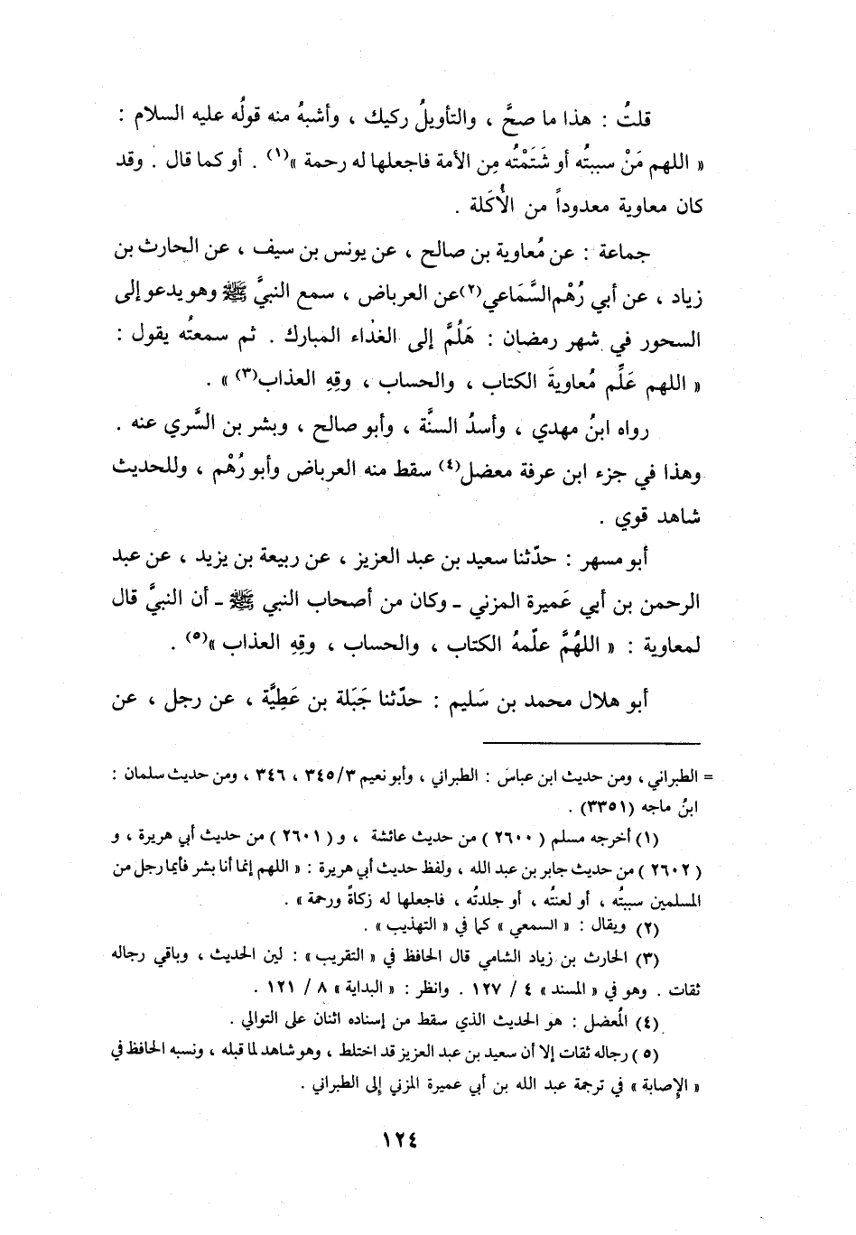 أَنَّ النَّبِيَّ -صَلَّى اللَّهُ عَلَيْهِ وَسَلَّمَ - قَالَ لِمُعَاوِيَةَ: (اللَّهُمَّ عَلِّمْهُ الكِتَابَ، وَالحِسَابَ، وَقِهِ العَذَابَ (5)) .