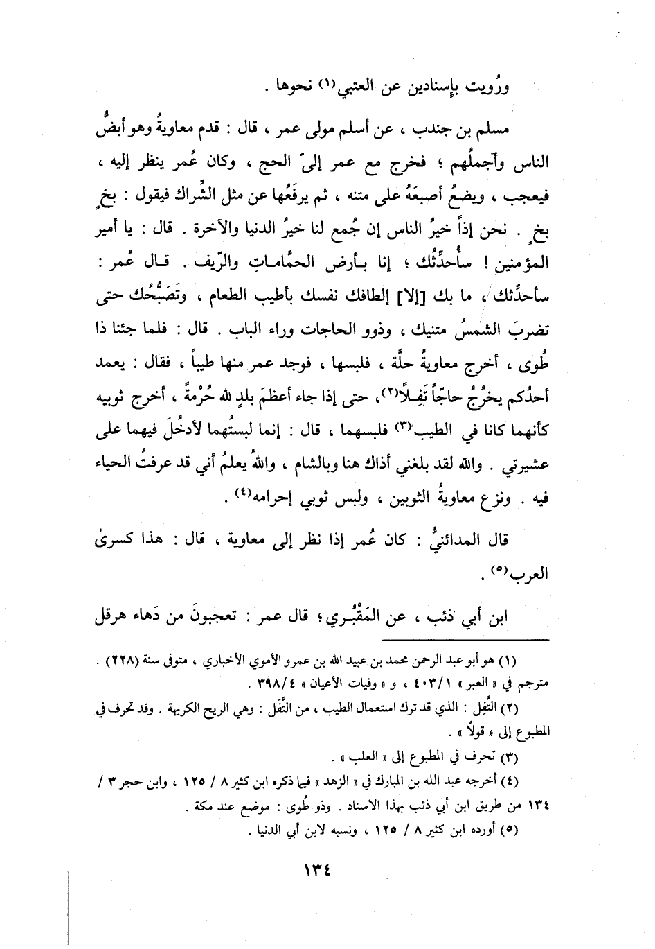 قَالَ: فَلَمَّا جِئْنَا ذَا طُوَىً، أَخْرَجَ مُعَاوِيَةُ حُلَّةً، فَلَبِسَهَا، فَوَجَدَ عُمَرُ مِنْهَا طِيْباً، فَقَالَ: