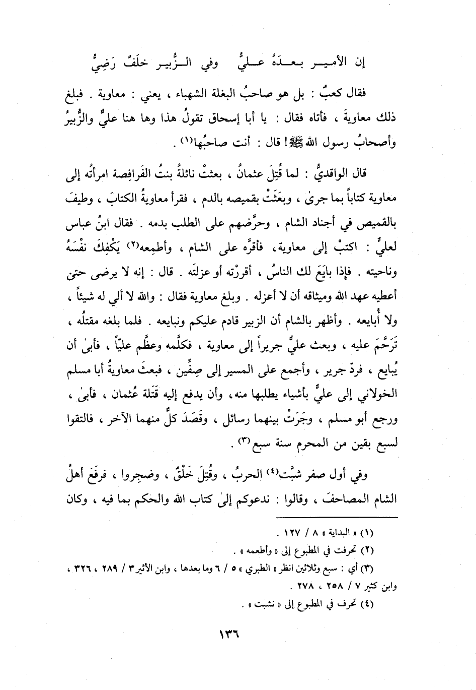 فَلَمَّا بَلَغَهُ مَقْتَلُهُ، تَرَحَّمَ عَلَيْهِ، وَبَعَثَ عَلِيٌّ جَرِيْراً إِلَى مُعَاوِيَةَ، فَكَلَّمَهُ، وَعَظَّمَ عَلِيّاً، فَأَبَى أَنْ يُبَايِعَ، فَرُدَّ جَرِيْرٌ، وَأَجْمَعَ عَلَى المَسِيْرِ إِلَى صِفِّيْنَ.
