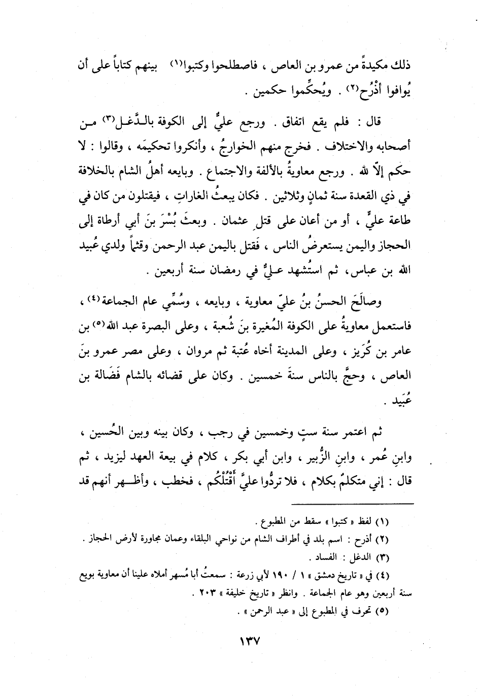 ذَلِكَ مَكِيدَةً مِنْ عَمْرِو بنِ العَاصِ، فَاصْطَلَحُوا، وَكَتَبُوا (1) بَيْنَهُم كِتَاباً عَلَى أَنْ يُوَافُوا أَذْرُحَ (2) ، وَيُحَكِّمُوا حَكَمَيْنِ.