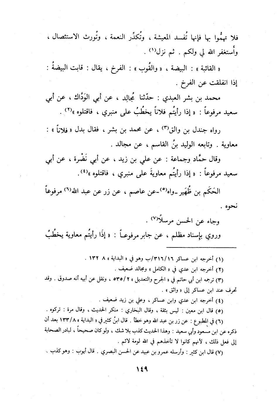 وَقَالَ حَمَّادٌ، وَجَمَاعَةٌ: عَنْ عَلِيِّ بنِ زَيْدٍ، عَنْ أَبِي نَضْرَةَ، عَنْ أَبِي سَعِيْدٍ، مَرْفُوعاً: (إِذَا رَأَيْتُم مُعَاوِيَةَ عَلَى مِنْبَرِي، فَاقْتُلُوْهُ (4)) .