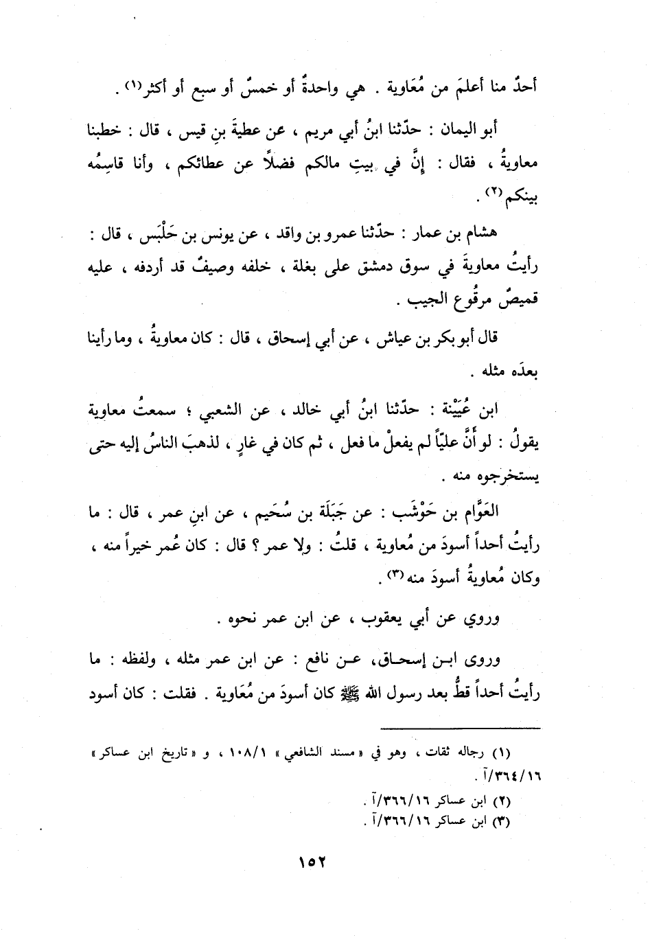 العَوَّامُ بنُ حَوْشَبٍ: عَنْ جَبَلَةَ بنِ سُحَيْمٍ، عَنِ ابْنِ عُمَرَ، قَالَ: مَا رَأَيْتُ أَحَداً أَسْوَدَ مِنْ مُعَاوِيَةَ.