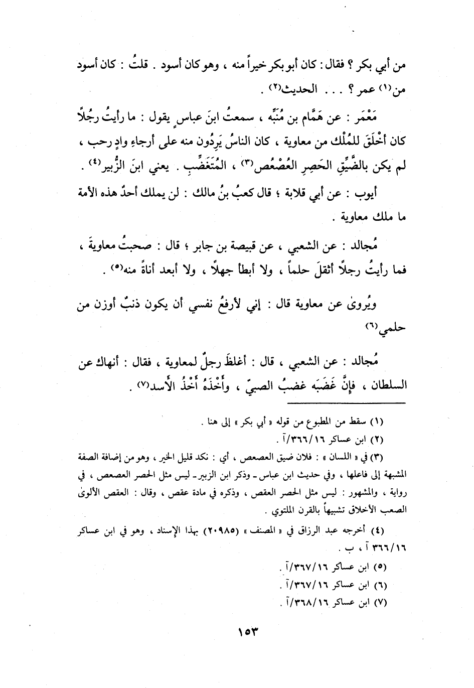 مَا رَأَيْتُ رَجُلاً كَانَ أَخْلَقَ لِلمُلْكِ مِنْ مُعَاوِيَةَ، كَانَ النَّاسُ يَرِدُوْنَ مِنْهُ عَلَى أَرْجَاءِ وَادٍ رَحْبٍ، لَمْ يَكُنْ بِالضَّيِّقِ، الحَصِرِ، العُصْعُصِ (3) ، المُتَغَضِّبِ -يَعْنِي: ابْنَ الزُّبَيْرِ (4) -.