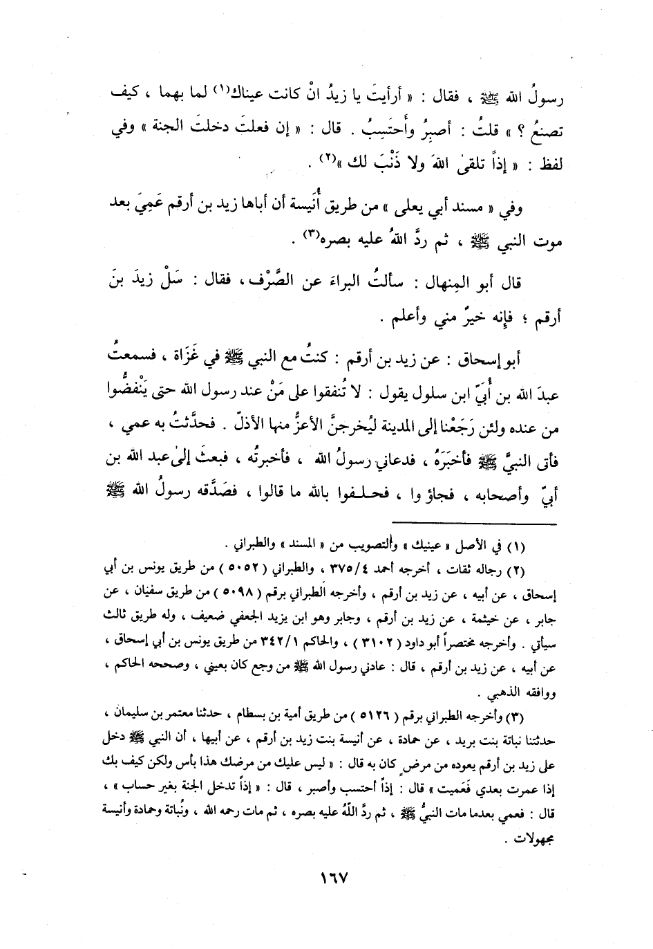 (3) وأخرجه الطبراني برقم (5126) من طريق أمية بن بسطام، حدثنا معتمر بن سليمان، حدثنا نباتة بنت بريد، عن حمادة، عن أنيسة بنت زيد بن أرقم، عن أبيها، أن النبي صلى الله عليه وسلم دخل على زيد بن أرقم يعوده من مرض كان به قال: " ليس عليك من مرضك هذا بأس ولكن كيف بك إذا عمرت بعدي فعميت " قال: إذا أحتسب وأصبر، قال: " إذا تدخل الجنة بغير حساب "، قال: فعمي بعدما مات النبي صلى الله عليه وسلم، ثم رد الله عليه بصره، ثم مات رحمه الله، ونباتة وحمادة وأنيسة مجهولات.