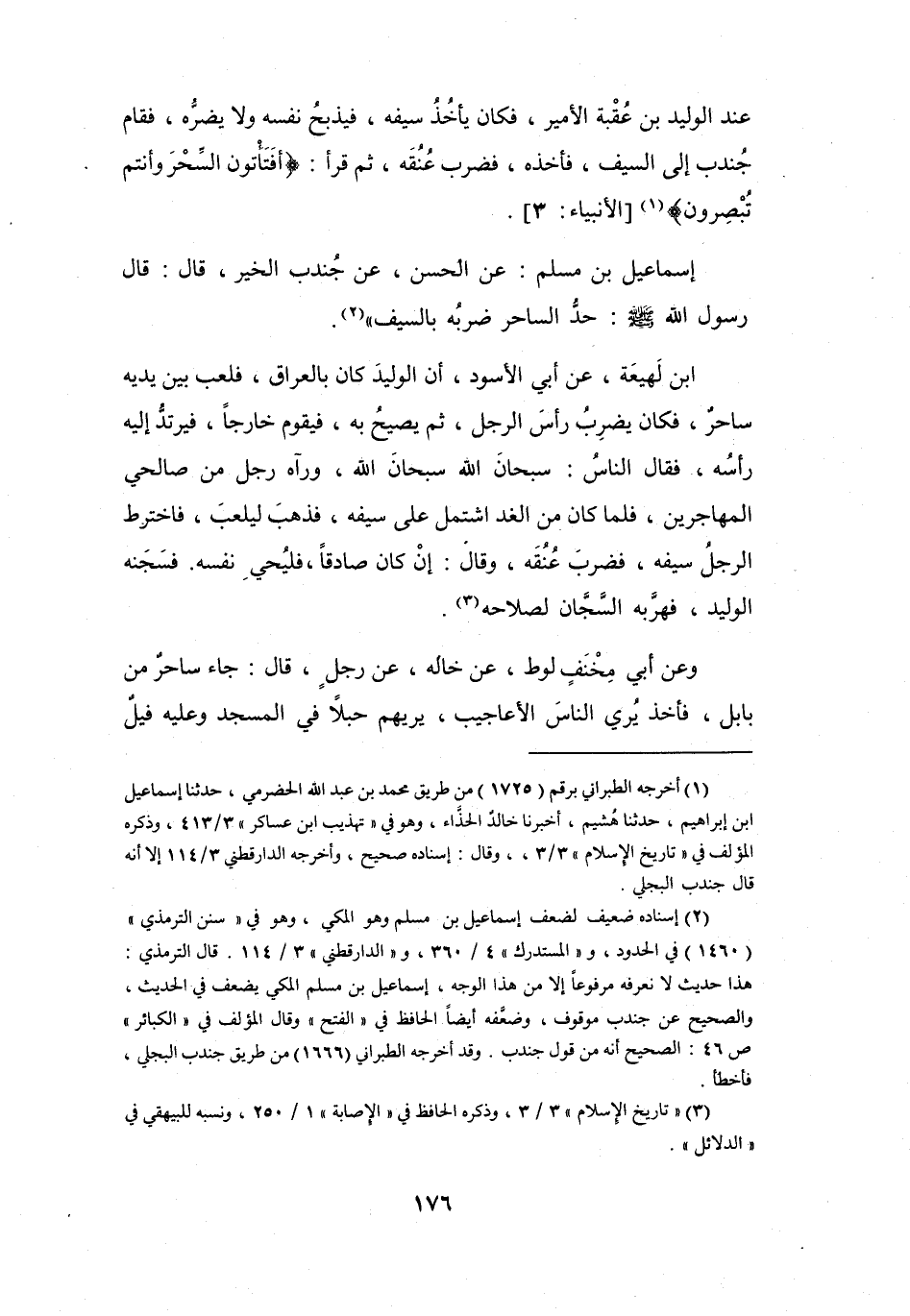 فَقَامَ جُنْدُبٌ إِلَى السَّيْفِ، فَأَخَذَهُ، فَضَرَبَ عُنُقَهُ، ثُمَّ قَرَأَ: {أَفَتَأْتُوْنَ السِّحْرَ وَأَنْتُم تُبْصِرُوْنَ (1) } [الأَنْبِيَاءُ: 3] .
