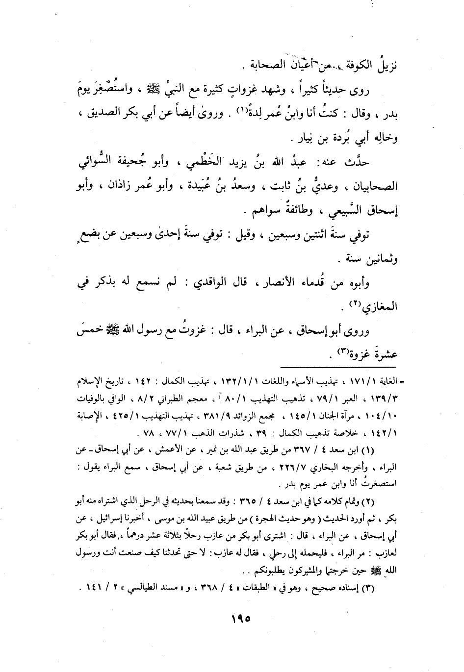 (1) ابن سعد 4 / 367 من طريق عبد الله بن نمير، عن الأعمش، عن أبي إسحاق - عن البراء، وأخرجه البخاري 7 / 226، من طريق شعبة، عن أبي إسحاق، سمع البراء يقول: استصغرت أنا وابن عمر يوم بدر.