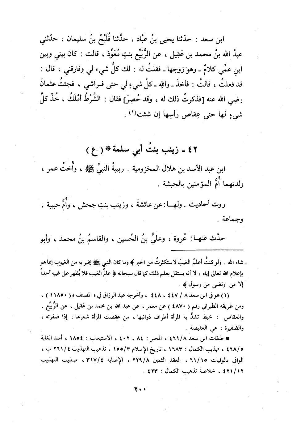 (*) طبقات ابن سعد 8 / 461، المحبر: 84، 402، الاستيعاب: 1854، أسد الغابة 5 / 468، تهذيب الكمال: 1683، تاريخ الإسلام 3 / 155، تذهيب التهذيب 4 / 261 ب، الوافي بالوفيات 15 / 61، العقد الثمين 8 / 229، الإصابة 4 / 317، تهذيب التهذيب 12 / 421، خلاصة تذهيب الكمال: 423.