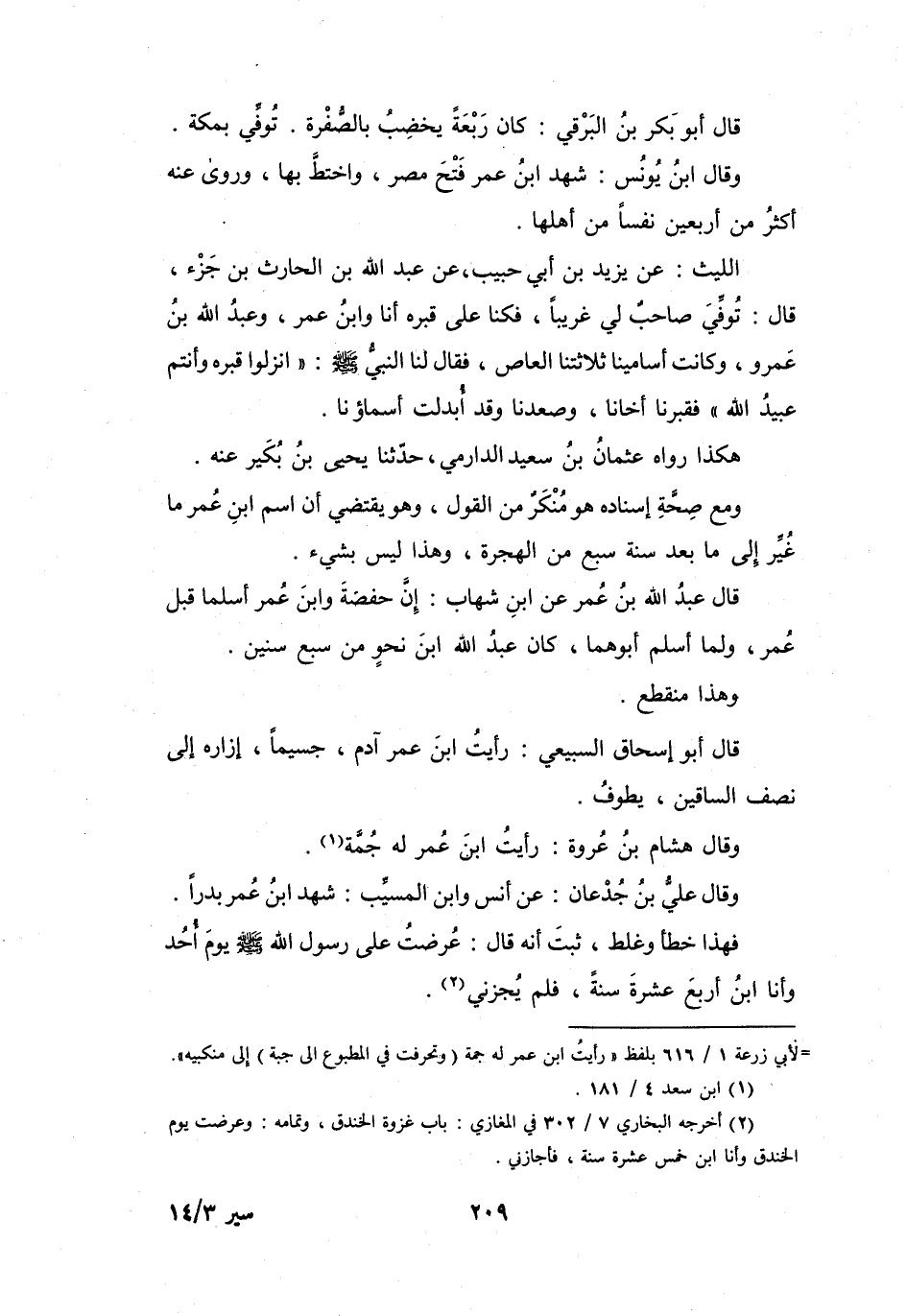 عُرِضْتُ عَلَى رَسُوْلِ اللهِ -صَلَّى اللَّهُ عَلَيْهِ وَسَلَّمَ - يَوْمَ أُحُدٍ، وَأَنَا ابْنُ أَرْبَعَ عَشْرَةَ سَنَةً، فَلَمْ يُجِزْنِي (2) .