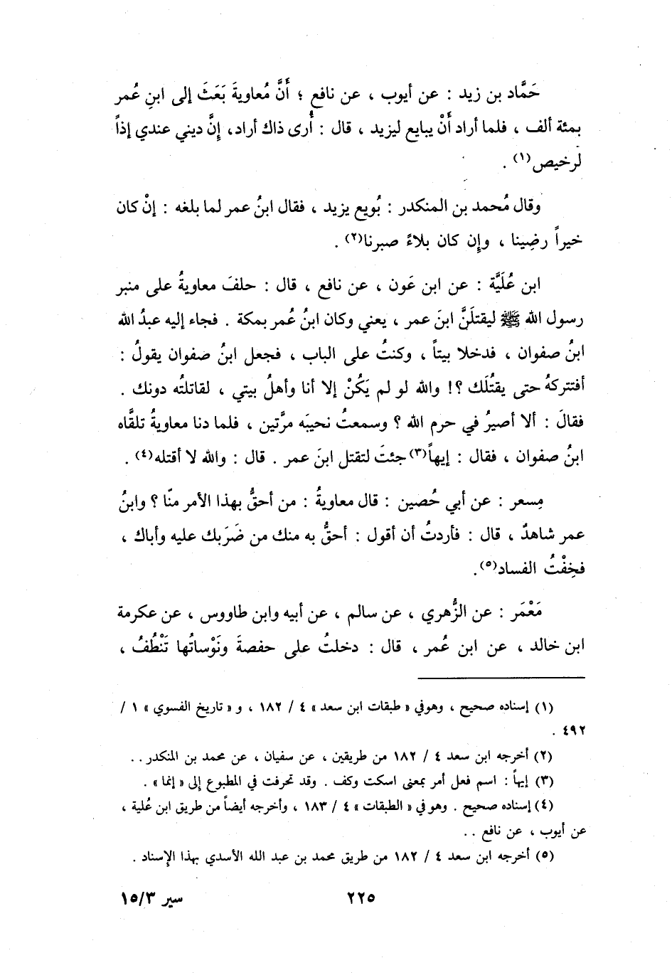 وَسَمِعْتُ نَحِيبَهُ مَرَّتَيْنِ، فَلَمَّا دَنَا مُعَاوِيَةُ، تَلقَّاهُ ابْنُ صَفْوَانَ، فَقَالَ: إِيهاً (3) ، جِئْتَ لِتقتُلَ ابْنَ عُمَرَ.
