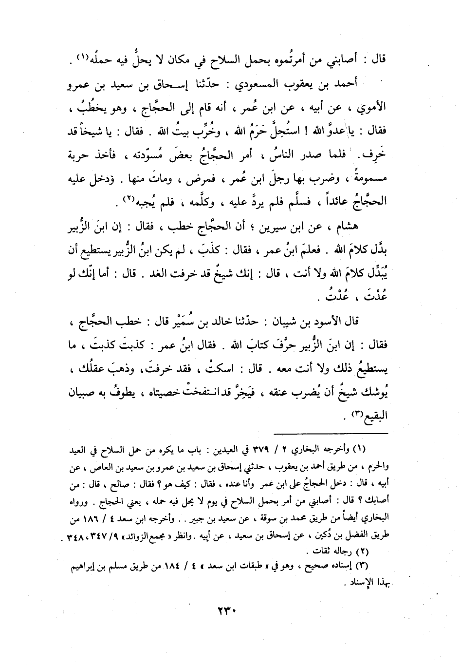 (1) وأخرجه البخاري 2 / 379 في العيدين: باب ما يكره من حمل السلاح في العيد والحرم، من طريق أحمد بن يعقوب، حدثني إسحاق بن سعيد بن عمرو بن سعيد بن العاص، عن أبيه، قال: دخل الحجاج على ابن عمر وأنا عنده، فقال: كيف هو؟ فقال: صالح، قال: من