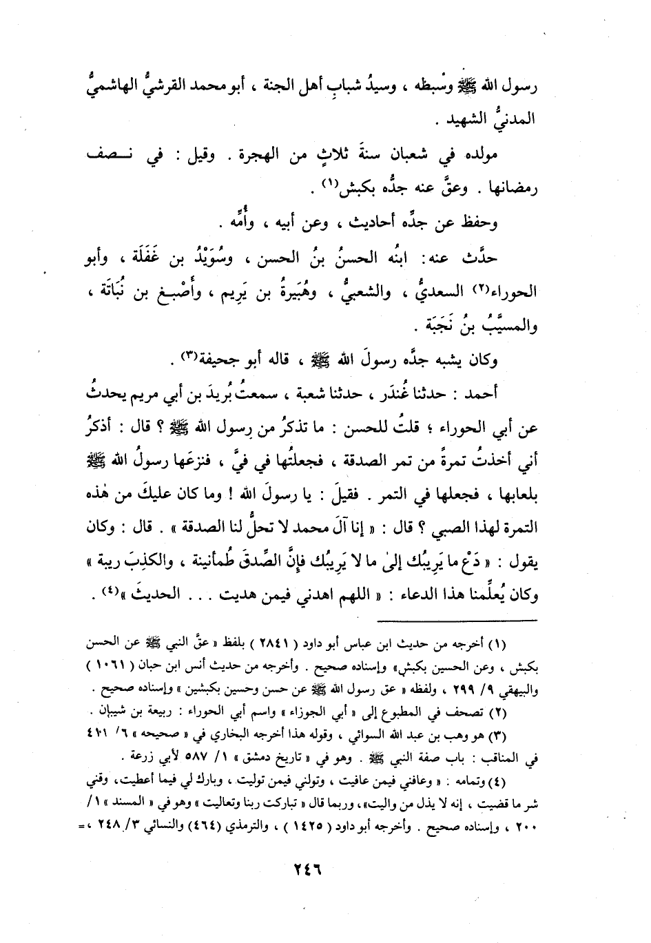 رَسُوْلِ اللهِ -صَلَّى اللَّهُ عَلَيْهِ وَسَلَّمَ - وَسِبْطُهُ، وَسَيِّدُ شَبَابِ أَهْلِ الجَنَّةِ، أَبُو مُحَمَّدٍ القُرَشِيُّ، الهَاشِمِيُّ، المَدَنِيُّ، الشَّهِيْدُ.