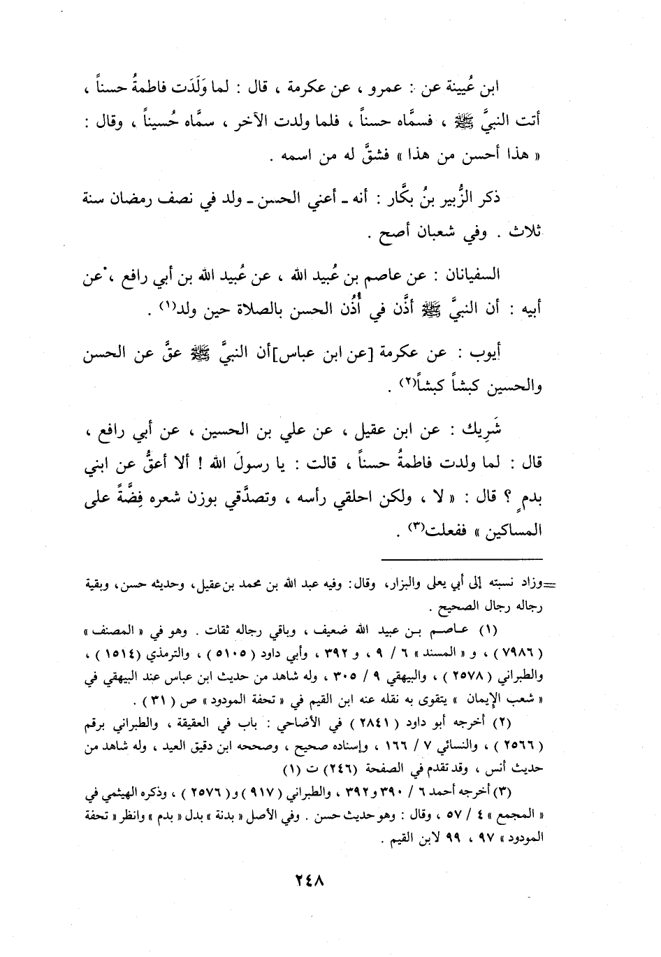 أَنَّ النَّبِيَّ -صَلَّى اللَّهُ عَلَيْهِ وَسَلَّمَ - عَقَّ عَنِ الحَسَنِ وَالحُسَيْنِ كَبْشاً كَبْشاً (2) .