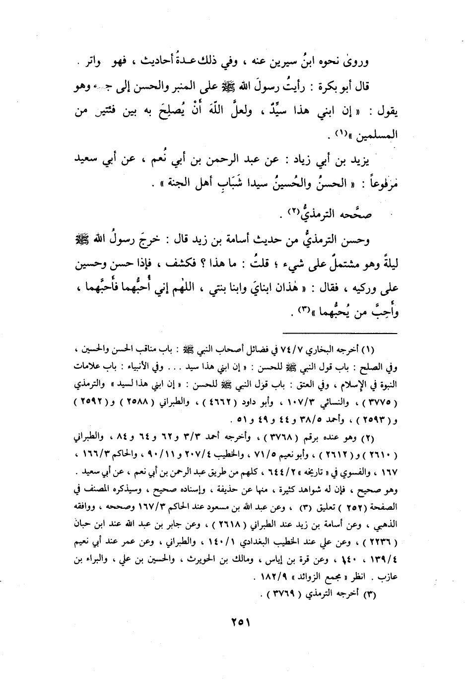 (1) أخرجه البخاري 7 / 74 في فضائل أصحاب النبي صلى الله عليه وسلم: باب مناقب الحسن والحسين، وفي الصلح: باب قول النبي صلى الله عليه وسلم للحسن: " إن ابني هذا سيد ... وفي الأنبياء: باب علامات النبوة في الإسلام، وفي العتق: باب قول النبي صلى الله عليه وسلم للحسن: " إن ابني هذا لسيد " والترمذي (3775) ، والنسائي 3 / 107، وأبو داود (4662) ، والطبراني (2588) و (2592) و (2593) ، وأحمد 5 / 38 و44 و49 و51.