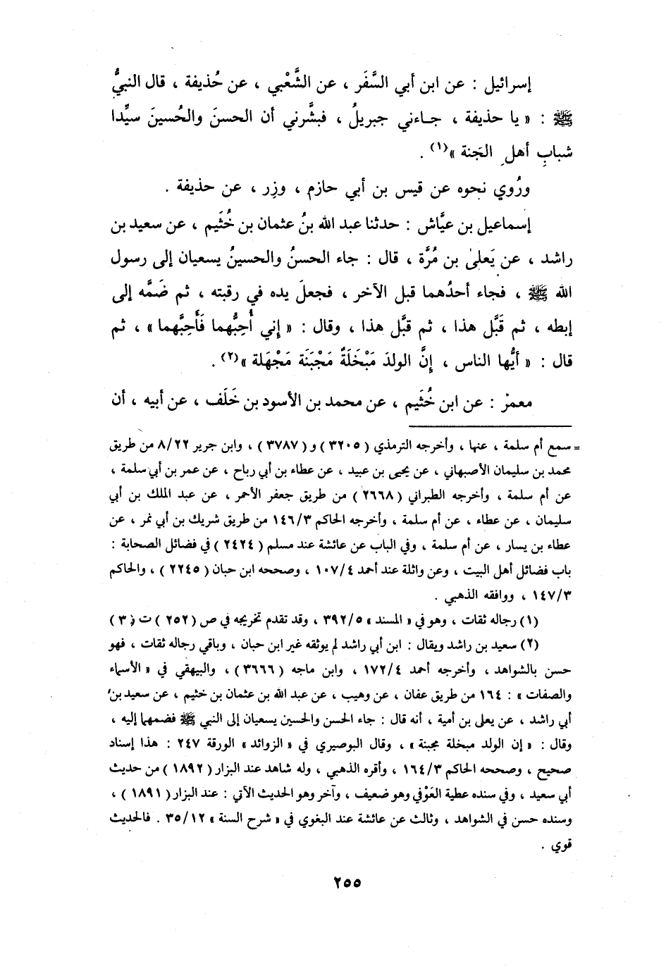 (2) سعيد بن راشد ويقال: ابن أبي راشد لم يوثقه غير ابن حبان، وباقي رجاله ثقات، فهو حسن بالشواهد، وأخرجه أحمد 4 / 172، وابن ماجه (3666) ، والبيهقي في " الأسماء والصفات ": 164 من طريق عفان، عن وهيب، عن عبد الله بن عثمان بن خيثم، عن سعيد بن أبي راشد، عن يعلى بن أمية، أنه قال: جاء الحسن والحسين يسعيان إلى النبي صلى الله عليه وسلم فضمهما إليه، وقال: " إن الولد مبخلة مجبنة "، وقال البوصيري في " الزوائد " الورقة 247: هذا إسناد صحيح، وصححه الحاكم 3 / 164، وأقره الذهبي، وله شاهد عند البزار (1892) من حديث أبي سعيد، وفي سنده عطية العوفي وهو ضعيف، وآخر وهو الحديث الآتي: عند البزار (1891) ، وسنده حسن في الشواهد، وثالث عن عائشة عند البغوي في " شرح السنة " 12 / 35. فالحديث قوي.