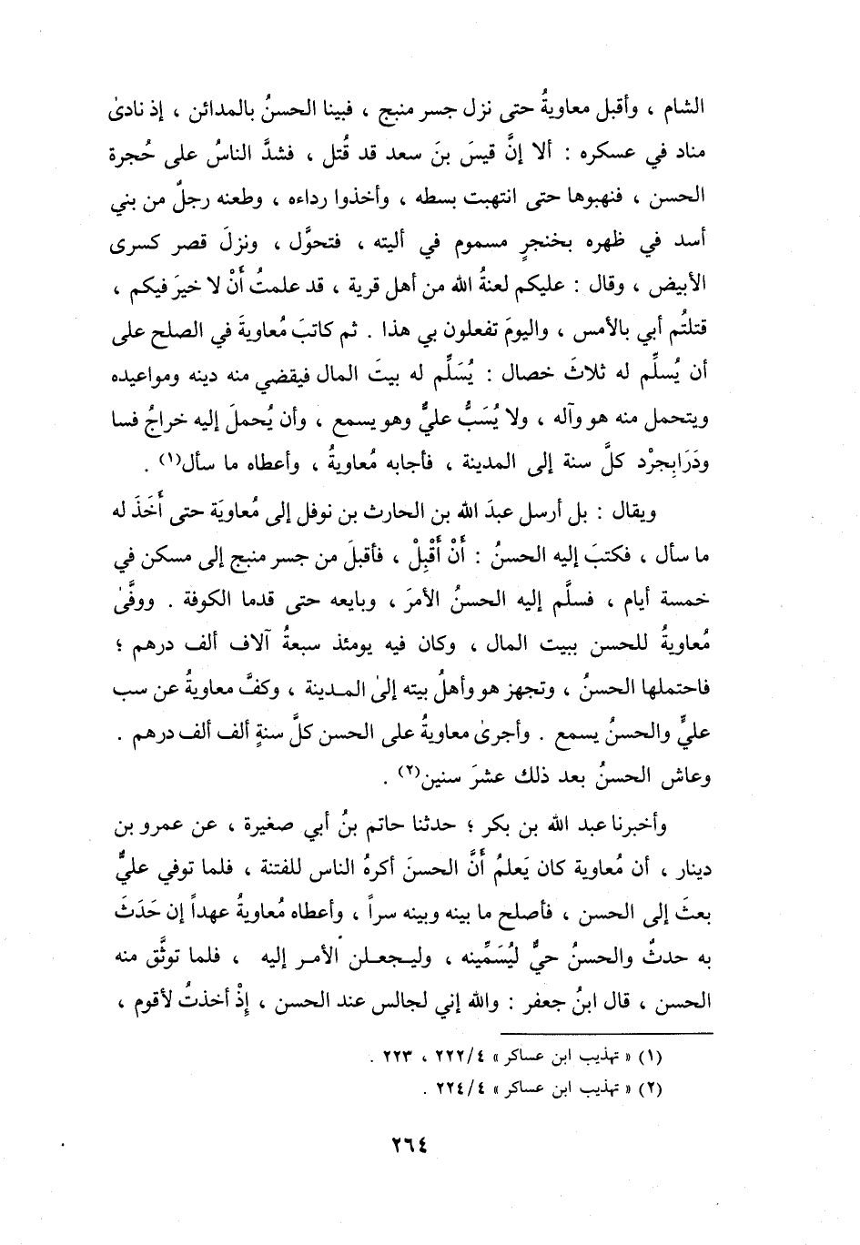 ثُمَّ كَاتَبَ مُعَاوِيَةَ فِي الصُّلْحِ عَلَى أَنْ يُسِلِّمَ لَهُ ثَلاَثَ خِصَالٍ: يُسلِّمَ لَهُ بَيْتَ المَالِ فَيَقْضِي مِنْهُ دَيْنَهُ وَمَوَاعِيدَهُ وَيَتحمَّلَ مِنْهُ هُوَ وَآلُهُ، وَلاَ يُسَبَّ عَلِيٌّ وَهُوَ يَسَمَعُ، وَأَنْ يُحملَ إِلَيْهِ خَرَاجُ فَسَا وَدَرَابْجِرْدَ كُلَّ سَنَةٍ إِلَى المَدِيْنَةِ، فَأَجَابَهُ مُعَاوِيَةُ، وَأَعْطَاهُ مَا سَأَلَ (1) .