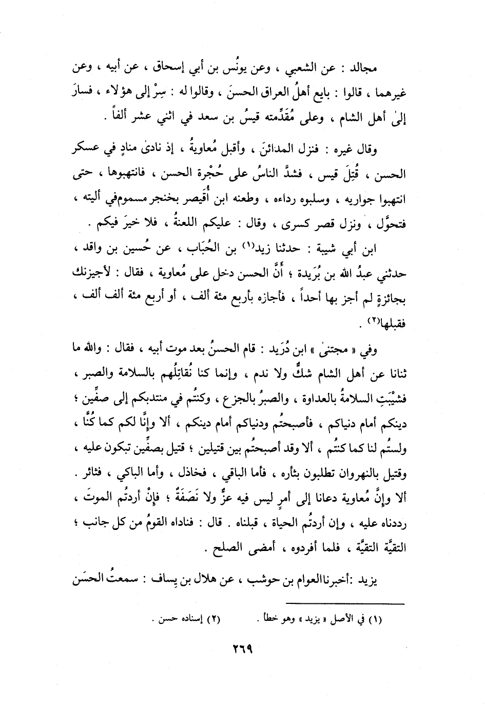 وَفِي (مُجْتَنَى) ابْنِ دُرَيْدٍ: قَامَ الحَسَنُ بَعْدَ مَوْتِ أَبِيْهِ، فَقَالَ: وَاللهِ مَا ثَنَانَا عَنْ أَهْلِ الشَّامِ شَكٌّ وَلاَ نَدَمٌ، وَإِنَّمَا كُنَّا نُقَاتِلُهُم بِالسَّلاَمَةِ وَالصَّبرِ، فَشِيبَتِ السَّلاَمَةُ بِالعَدَاوَةِ، وَالصَّبرُ بِالجَزعِ، وَكُنْتُم فِي مُنتدَبِكُم إِلَى صِفِّيْنَ؛ دِيْنُكُم أَمَامَ دُنْيَاكُم، فَأَصْبَحْتُم وَدُنْيَاكُم أَمَامَ دِيْنِكُم، أَلاَ وَإِنَّا لَكُم كَمَا كُنَّا، وَلَسْتُم لَنَا كَمَا كُنْتُم، أَلاَ وَقَدْ أَصْبَحْتُم بَيْنَ قَتِيْلَيْنِ؛ قَتيلٍ بِصِفِّيْنَ تَبكُوْنَ عَلَيْهِ، وَقَتيلٍ بِالنَّهْرَوَانِ تَطلُبُوْنَ بِثَأْرِهِ، فَأَمَّا البَاقِي، فَخَاذِلٌ، وَأَمَّا البَاكِي، فَثَائِرٌ.
